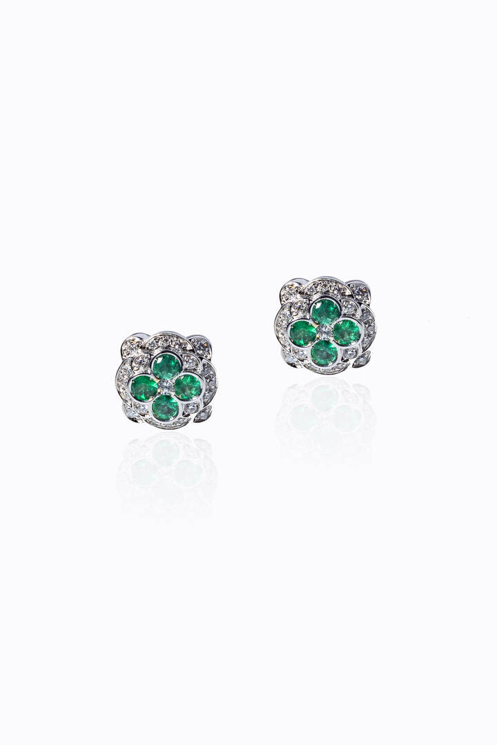 in oro bianco, di forma quadrata con otto smeraldi taglio rotondo per totali ct 0,50 ca e diamanti taglio brillante per totali ct 0,27 ca, probabile colore G-H, purezza IF-VVS
