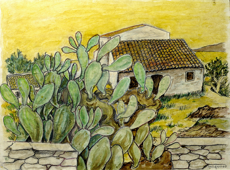 Giuseppe Migneco (Messina, 1908 - Milano, 1997) CASA TRA FICHI D’INDIA Tecnica mista su cartone, cm. 46x61 Firma in basso a destra; sul verso: titolo; timbro La Tavolozza, Riccione. Autentica dell’autore su foto con timbro Archivio Migneco e n. 1883