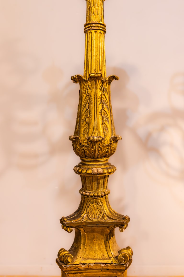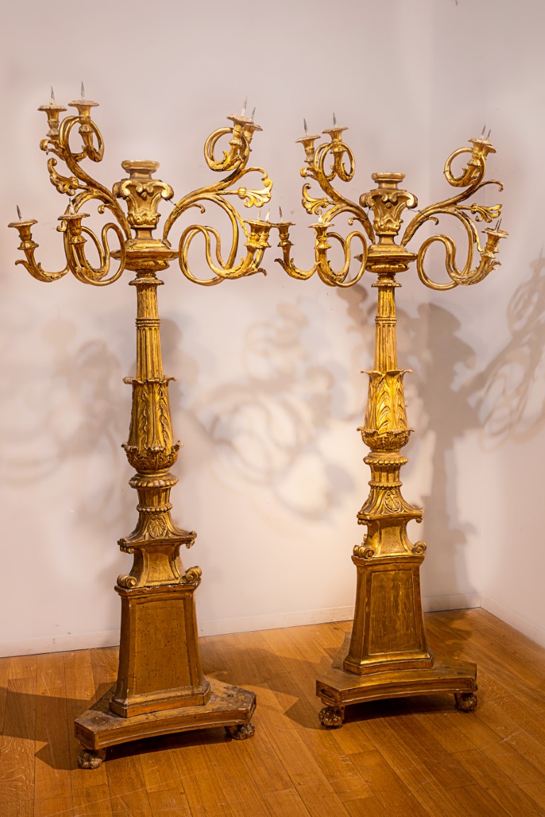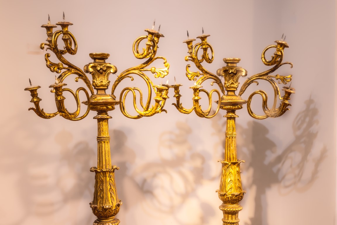 a due bracci sinuosi da cui dipartono quattro bracci portacandele in metallo dorato