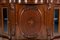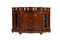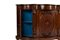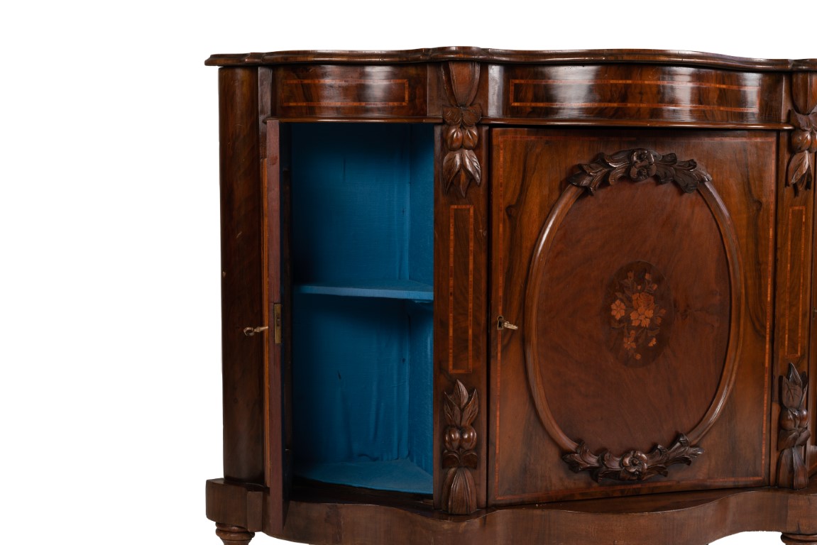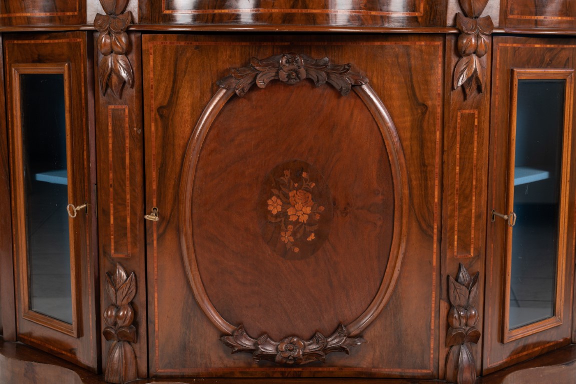 intagliata a motivi vegetali, fronte centrato da intarsio floreale e a nastrino, piano sagomato con becco di civetta, uno sportello centrale intarsiato e intagliato e due laterali a vetri, base sagomata, piedi a trottola