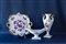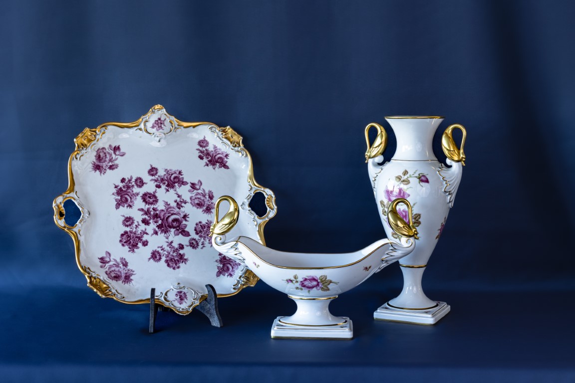 composto da un vassoio portadolci dipinto a motivi floreali in monocromia porpora e profili lumeggiati in oro, un vaso ad ancora e un centrotavola con prese a testa di cigno lumeggiate in oro e dipinti a motivi floreali