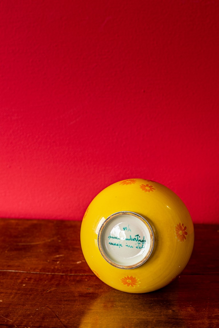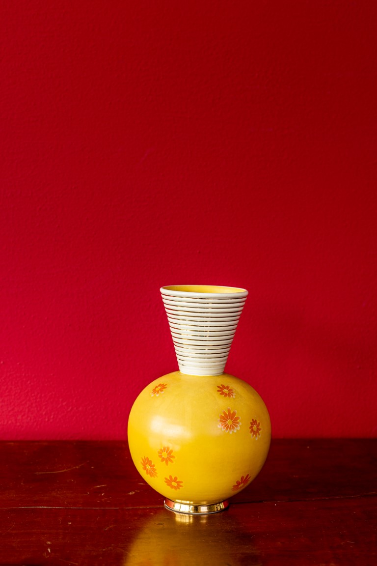Pucci, vaso globulare con collo a tromba in ceramica gialla e oro