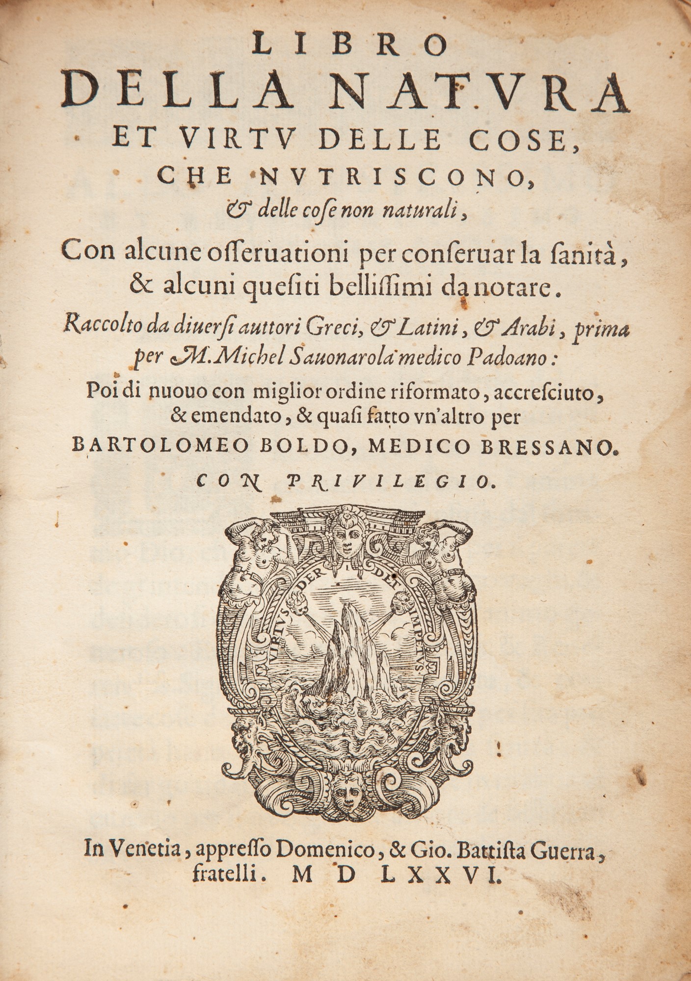 Michele Savonarola, Bartolomeo Boldo. Libro della natura et virtu delle cose, che nutriscono, e delle cose non naturali Con alcune osservationi per conservar la sanità & alcuni quesiti bellissimi da notare