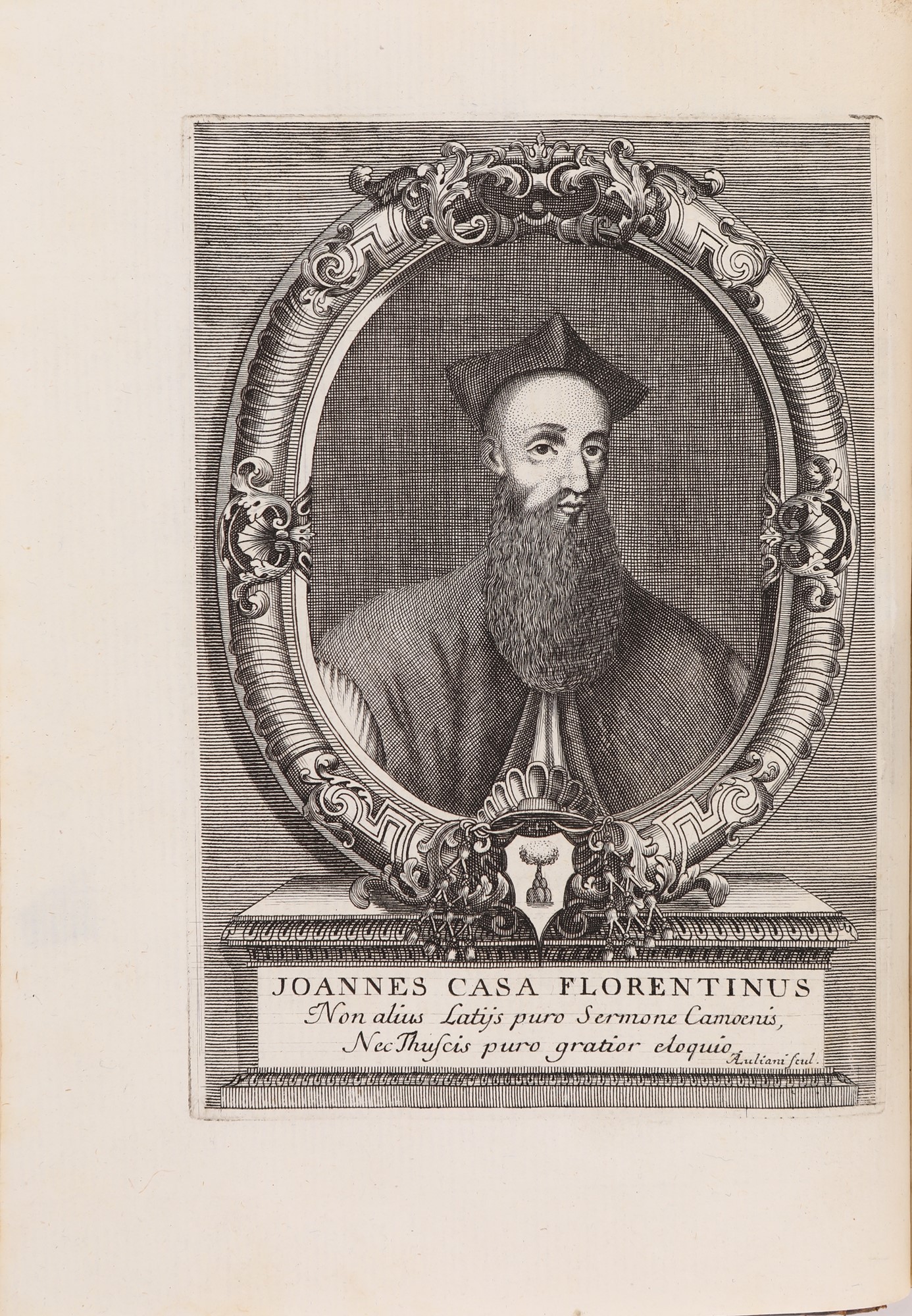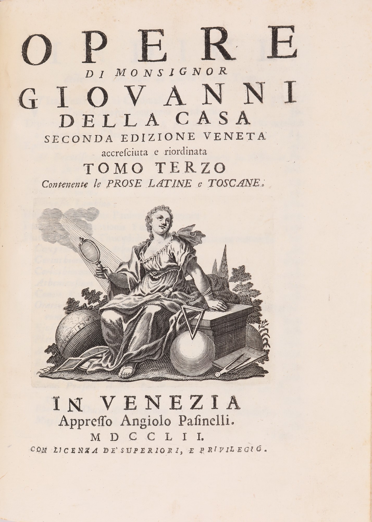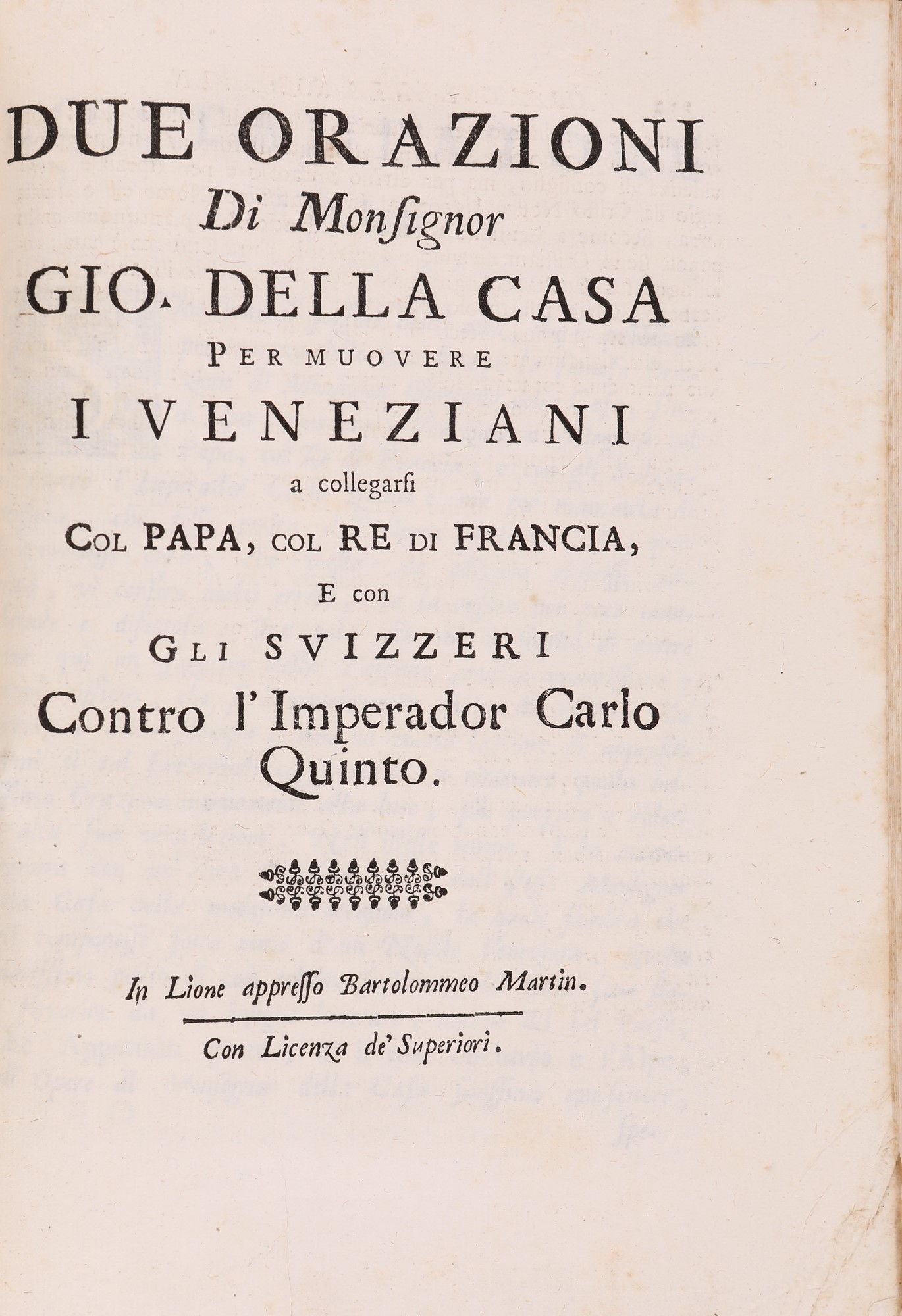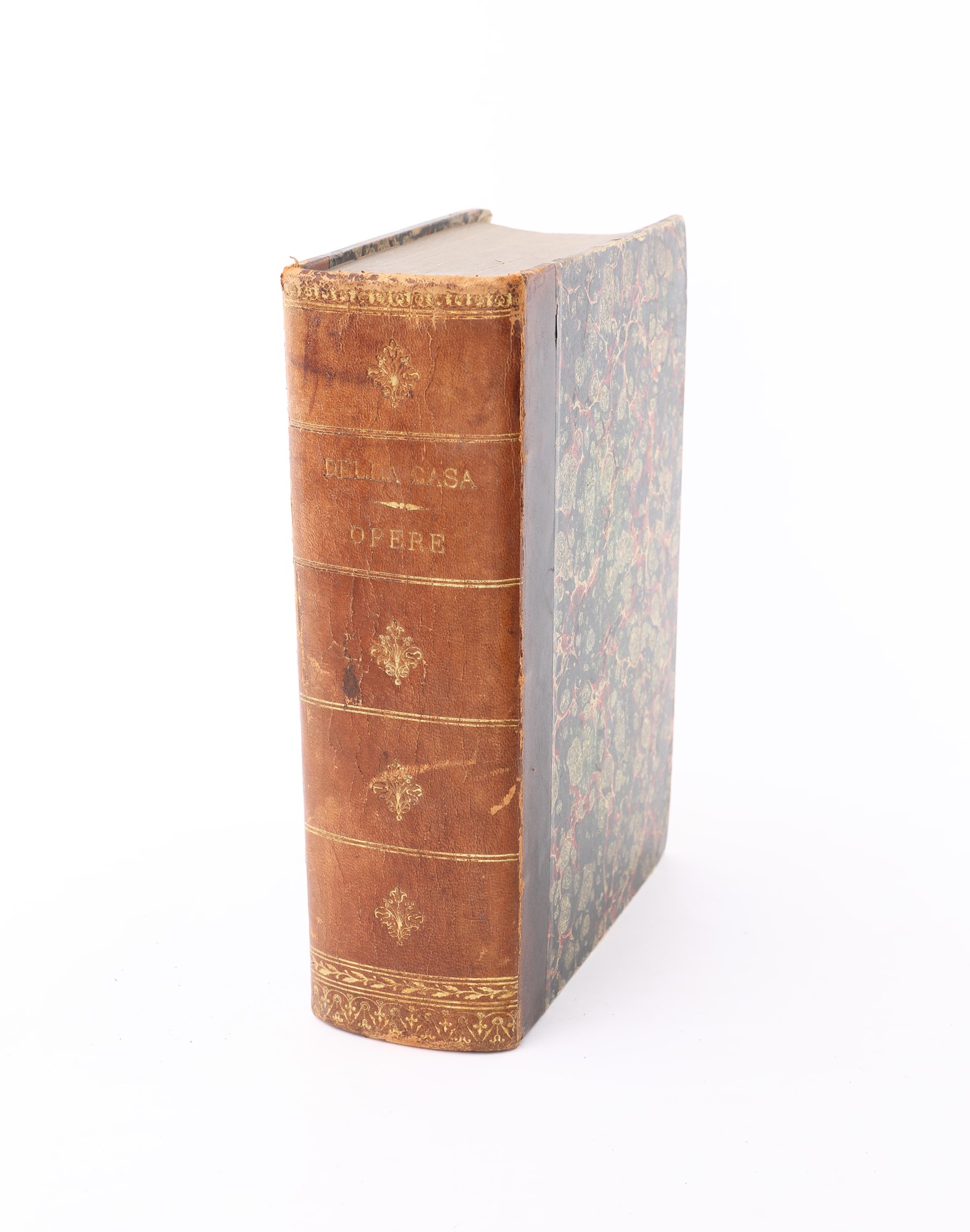 In 8° Tre tomi con proprio frontespizio in un volume. Di questa nuova edizione si prese cura Marco Forcellini, riordinando le "Opere" e togliendo via molti "Commenti", ponendo in luogo loro brevi "Annotazioni" ed una "Tavola di tutte le voci usate dal Casa". Il Forcellini arricchì questa stampa di 43 "Lettere non più stampate" e di un "Discorso in materia politica". Alla fine del terzo tomo è presente il fascicolo "Due Orazioni di Monsignor Gio. Della Casa per muovere i veneziani a collegarsi col Papa, col Re di Francia, e con gli Svizzeri contro l'Imperador Carlo Quinto". In Lione appresso Bartolommeo Martin s.d. Legatura in mezza pelle ottocentesca con titoli e fregi in oro al dorso.