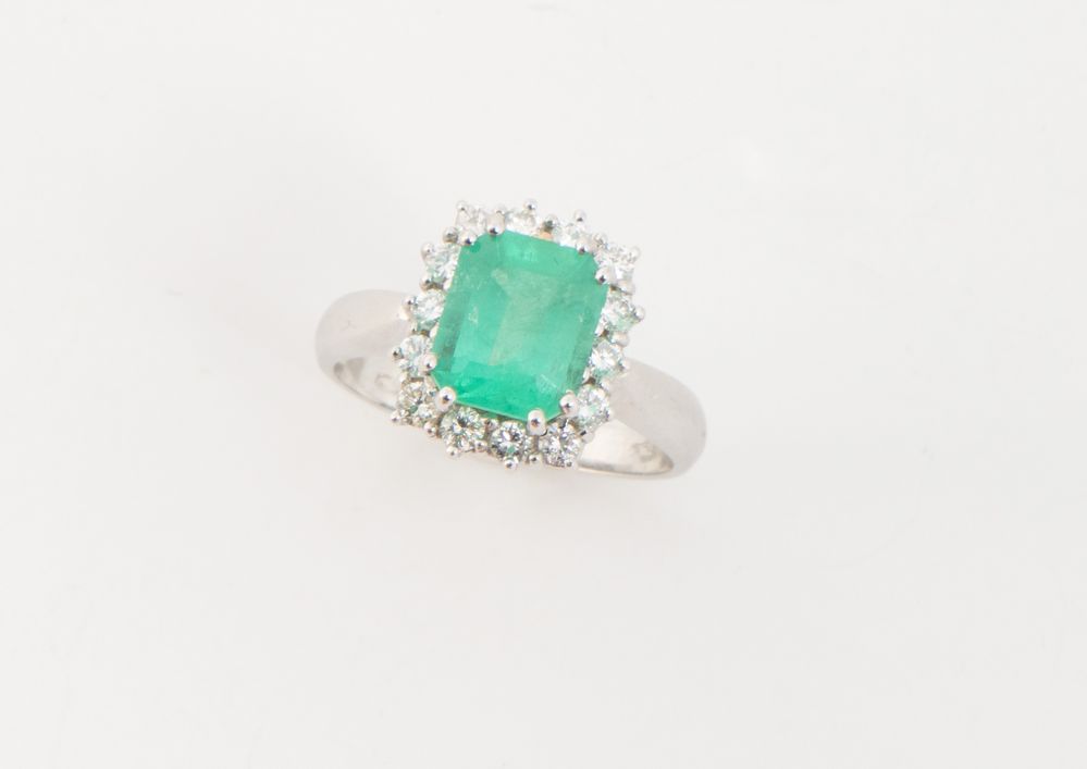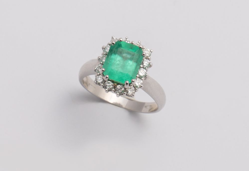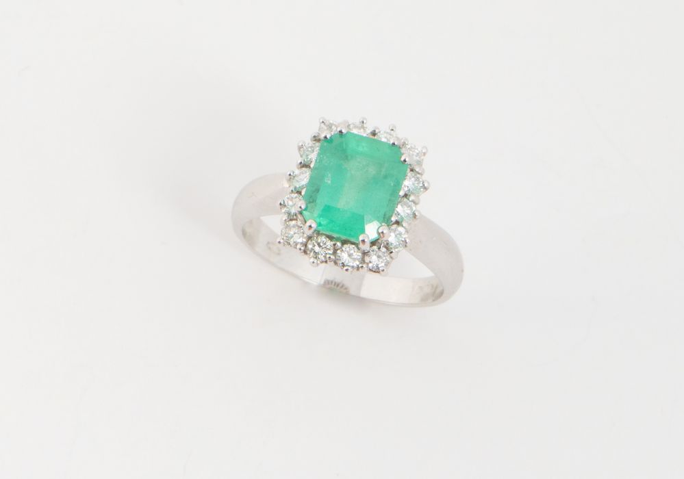 In oro bianco, realizzato con smeraldo ottagonale colombiano di 2,14 ct posto entro cornice di diamanti per un peso totale di 0,48 ct.