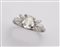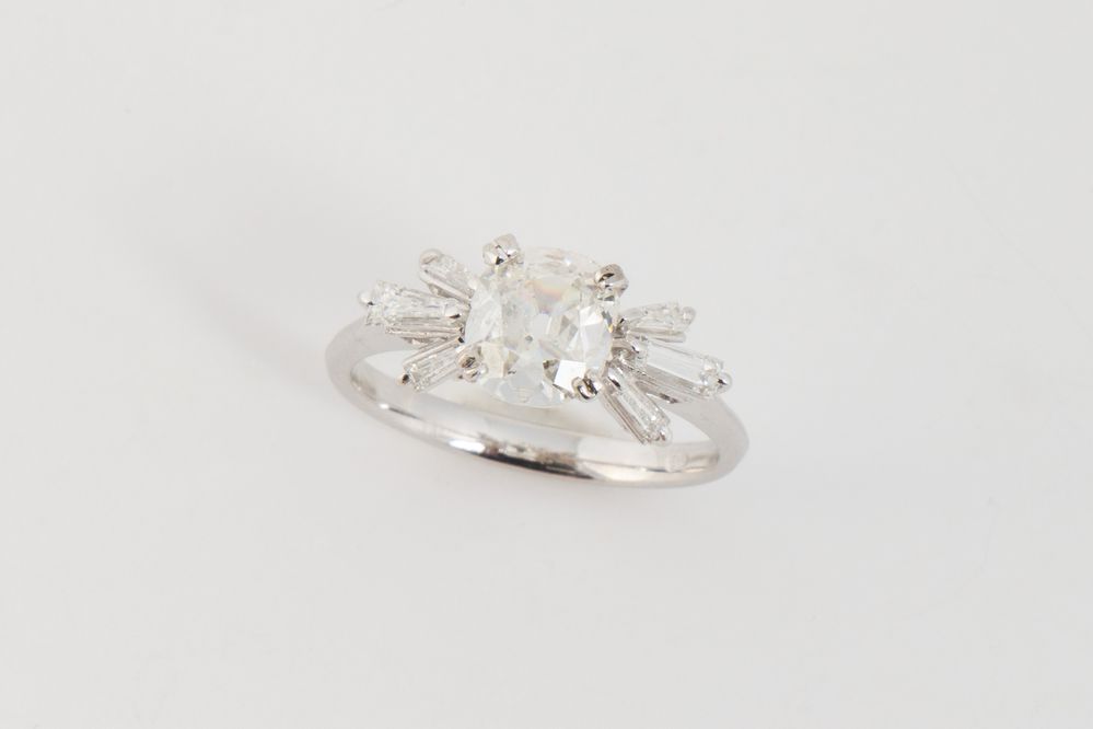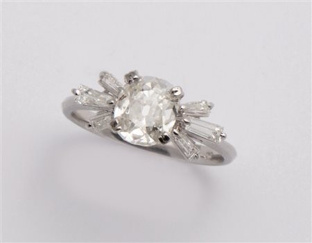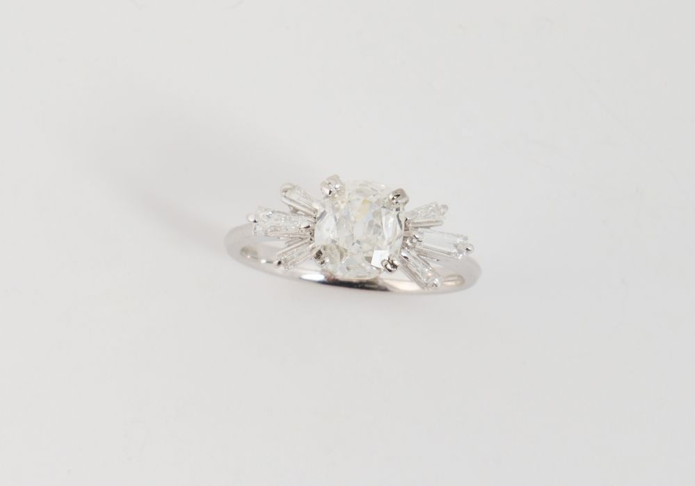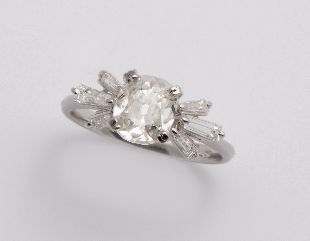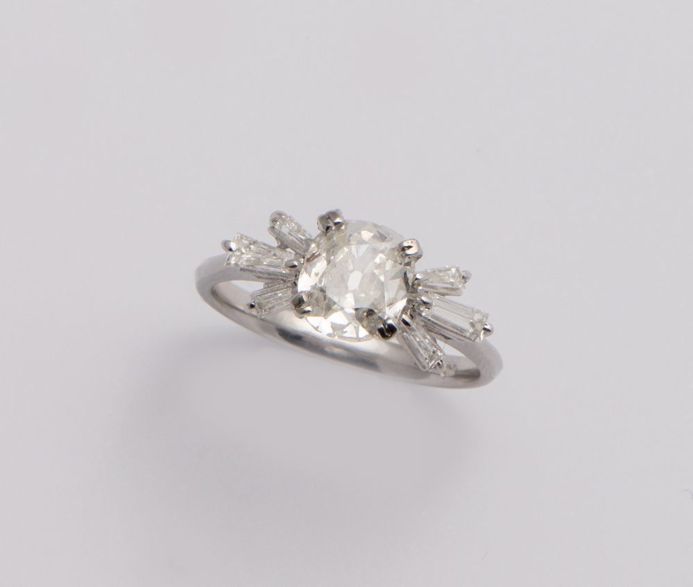 In oro bianco, realizzato con diamante solitario di taglio a cuscino del peso di 1,35 ct affiancato ai due lati da tapered baguettes per un peso stimato di 0,85 ct.