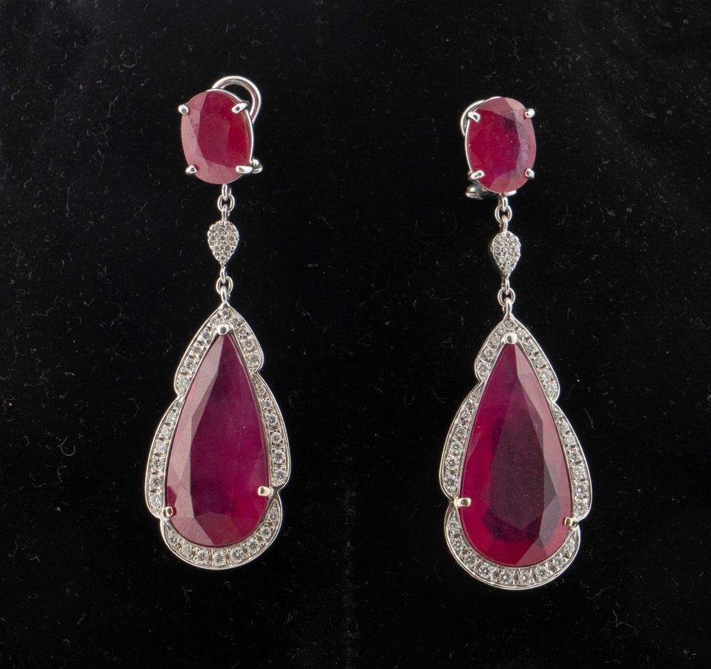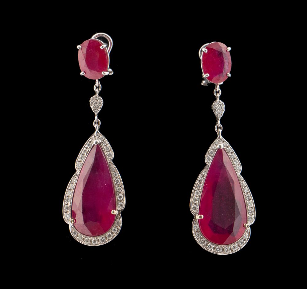 Ciascuno realizzato come un pendente impreziosito da diamanti e rubini (indicazioni di trattamento) di forma ovale e a goccia per un peso stimato di 60 ct circa.