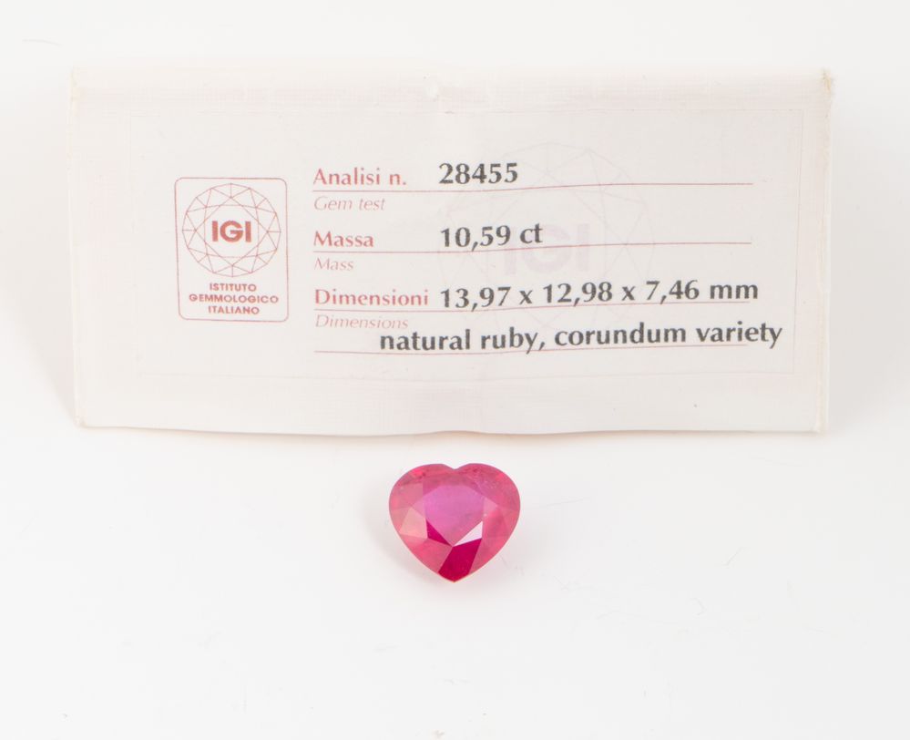 Di forma a cuore e taglio composito, peso 10,59 ct. Corredato da cartina e copia di analisi gemmologica n. 28455 redatta dall’Istituto Gemmologico Italiano (IGI).