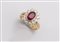 In oro giallo e bianco, centrato da rubino ovale sfaccettato del peso stimato di 1,80 ct, posto entro cornice di diamanti per un peso complessivo stimato di 0,85 ct, qualità G/VVS.