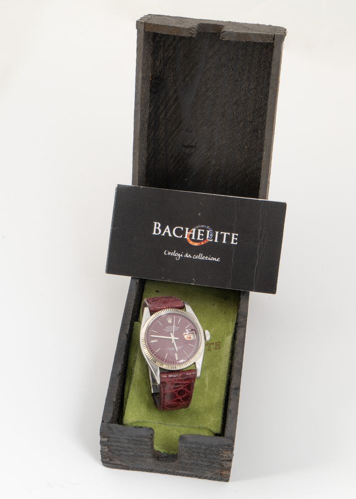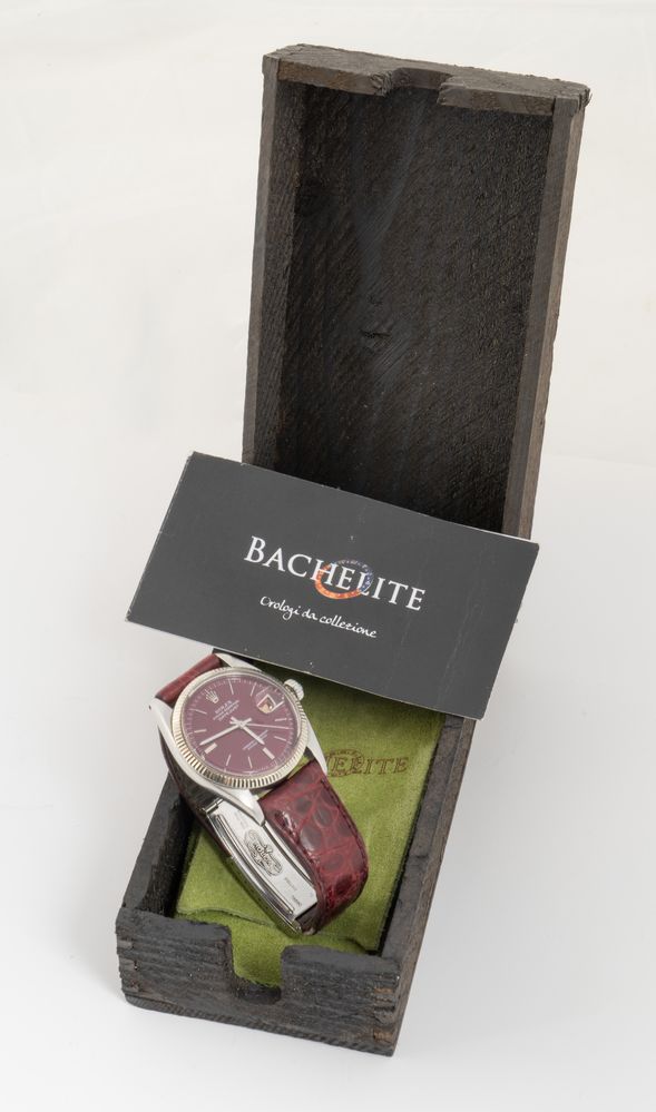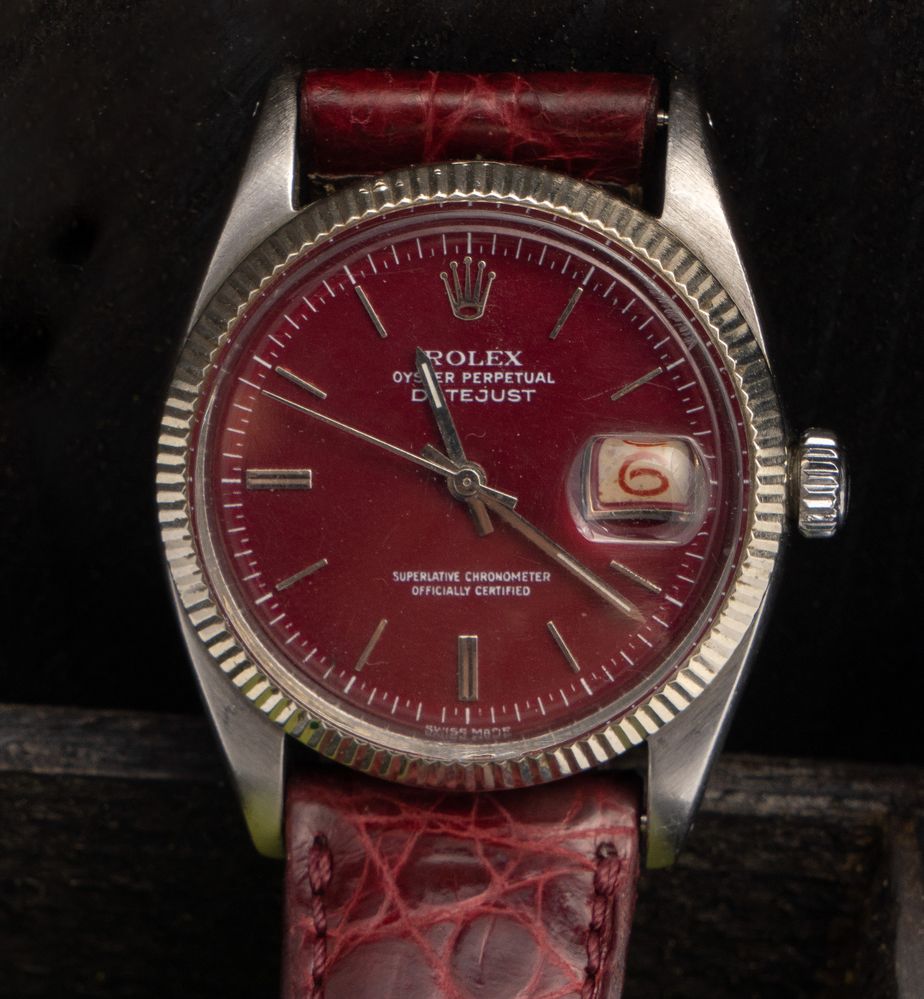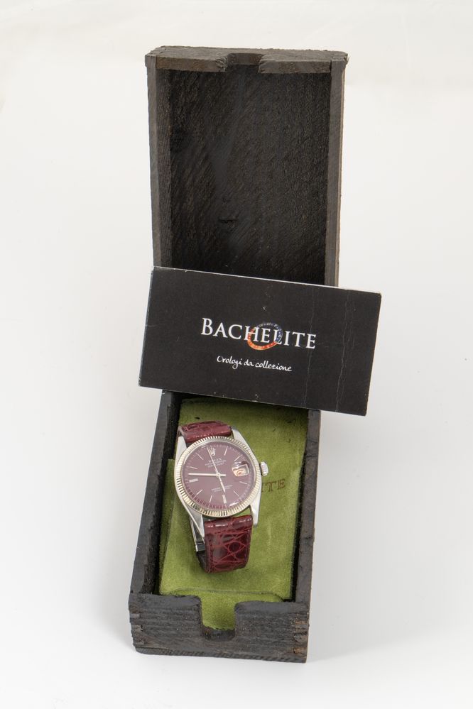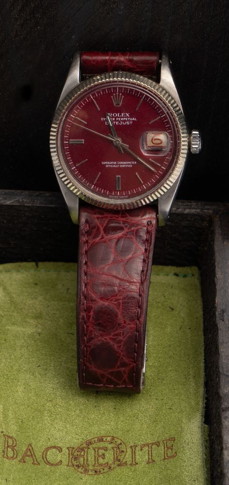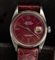 Cassa in acciaio, ref. 6605, ghiera zigrinata in oro, quadrante ristampato di colore rosso-bordeaux, indici applicati, datario a ore tre con lente cyclope, n. di cassa 3.5 milioni, anno indicativo di produzione 1957. Cinturino in pelle bordeaux.