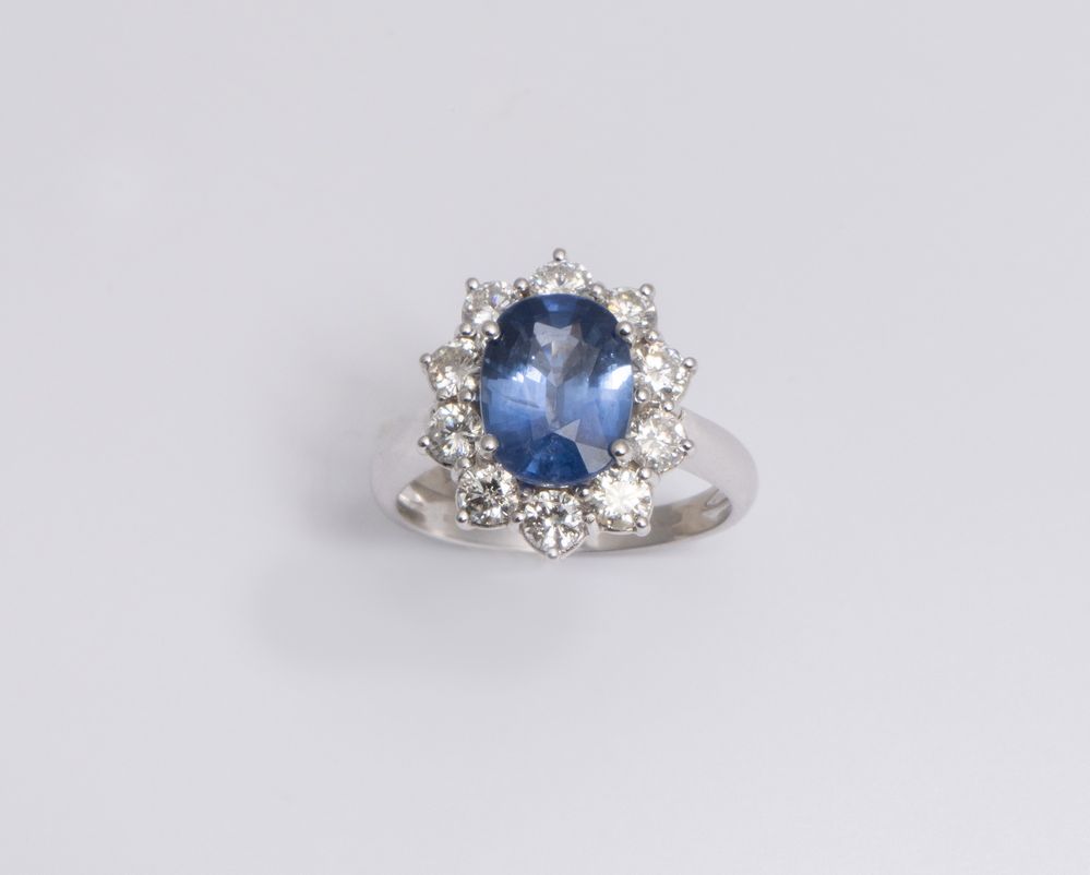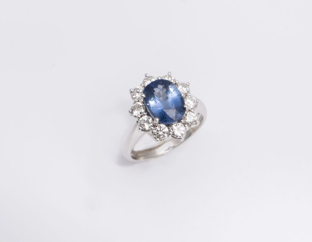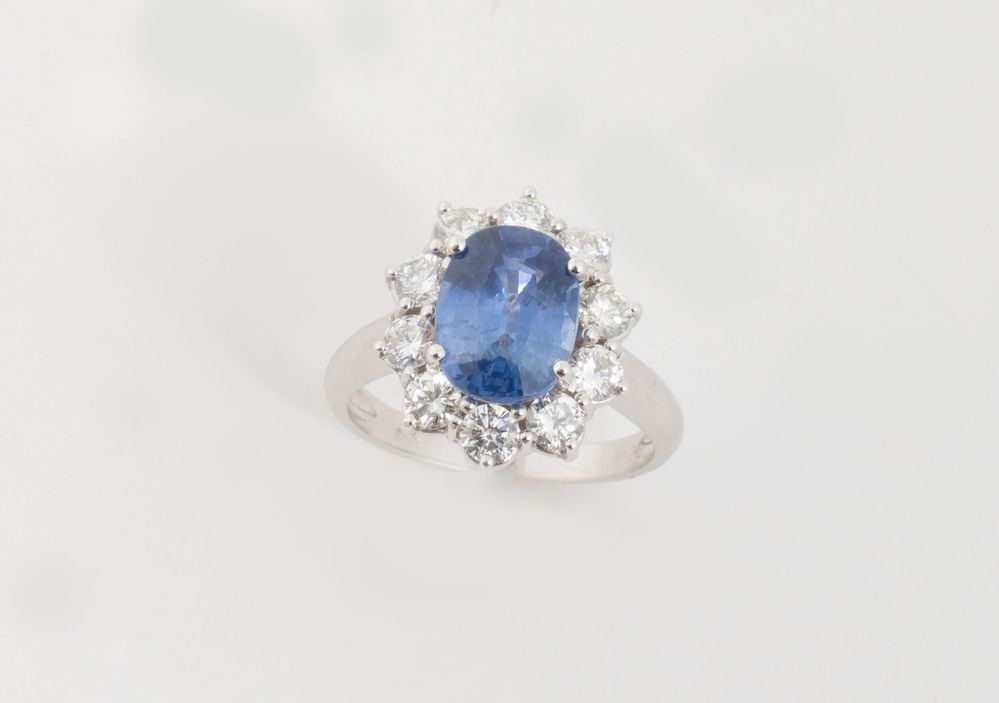 In oro bianco, centrato da zaffiro Ceylon blu ovale sfaccettato del peso di 3,22 ct, posto entro cornice di diamanti per un peso stimato di 1,20 ct.