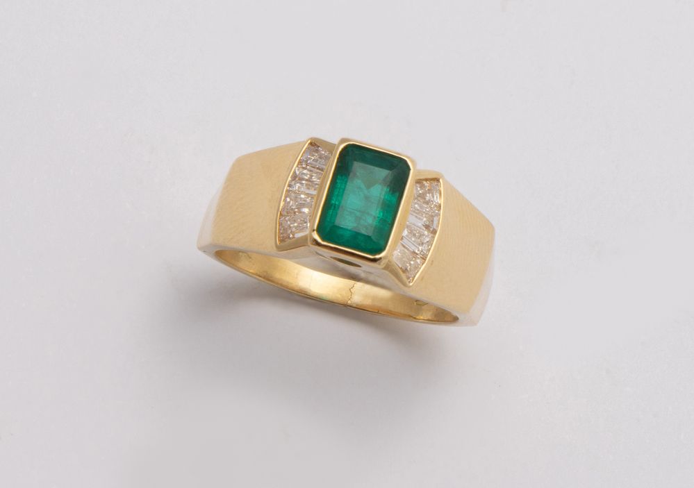 In oro giallo, realizzato con smeraldo ottagonale di 1,20 ct circa, affiancato ai due lati da un ventaglio di tapered baguettes in diamante.