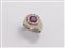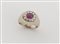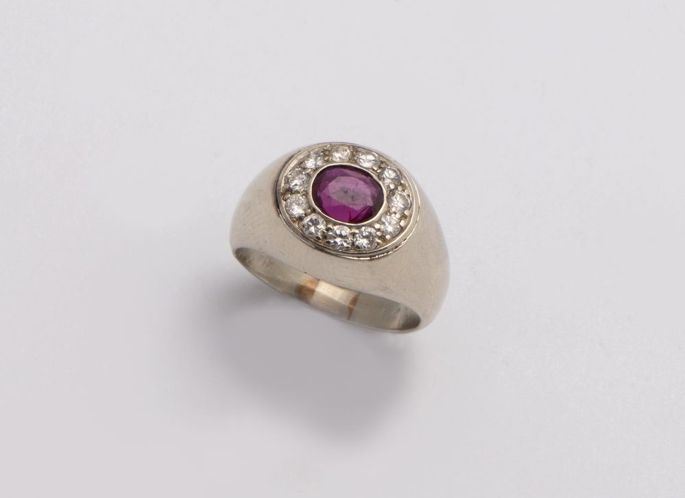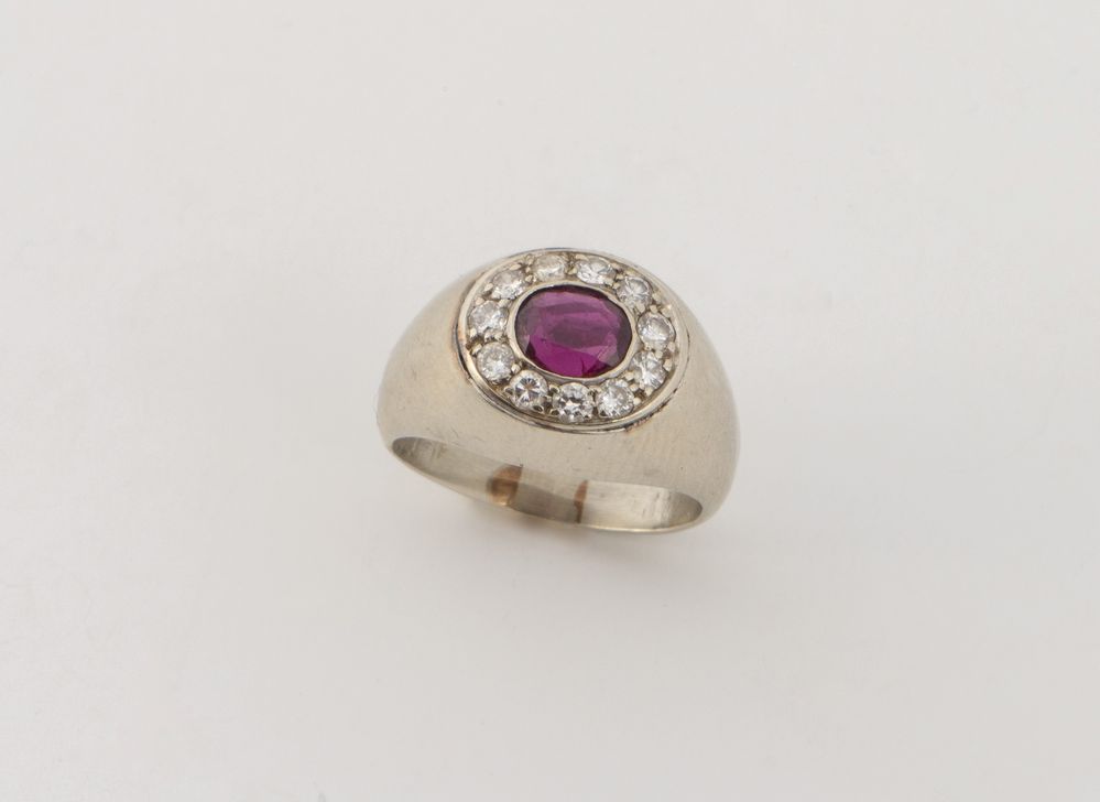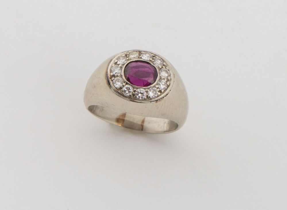 In oro bianco, realizzato con formella ovale centrata da rubino ovale posto entro cornice di diamanti.