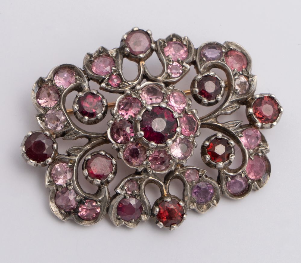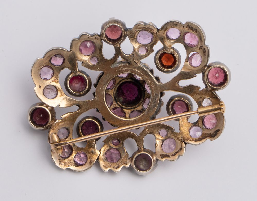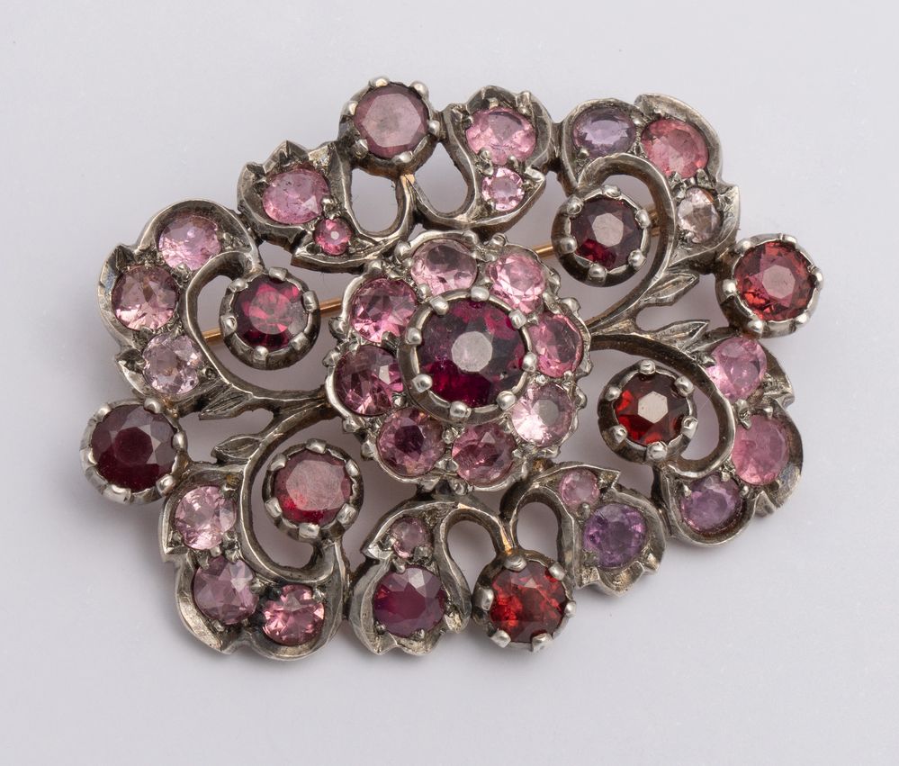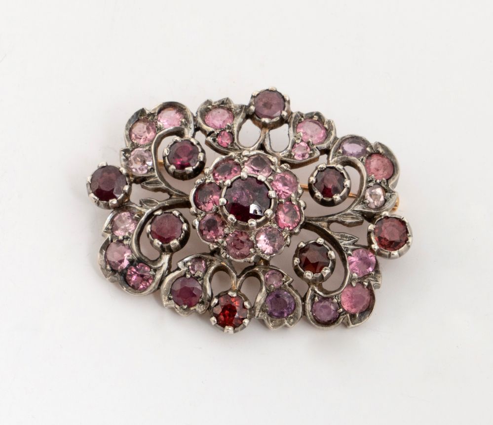 Realizzata in argento e oro a basso titolo seguendo un motivo floreale e vegetale, interamente decorata con granati e tormaline sfaccettate.