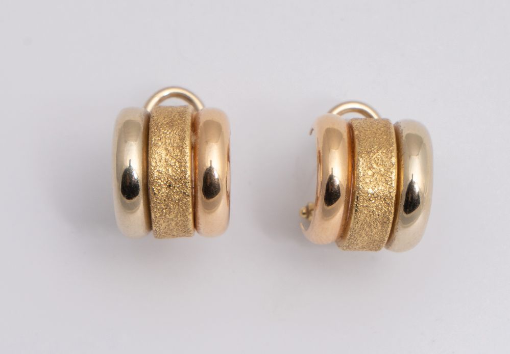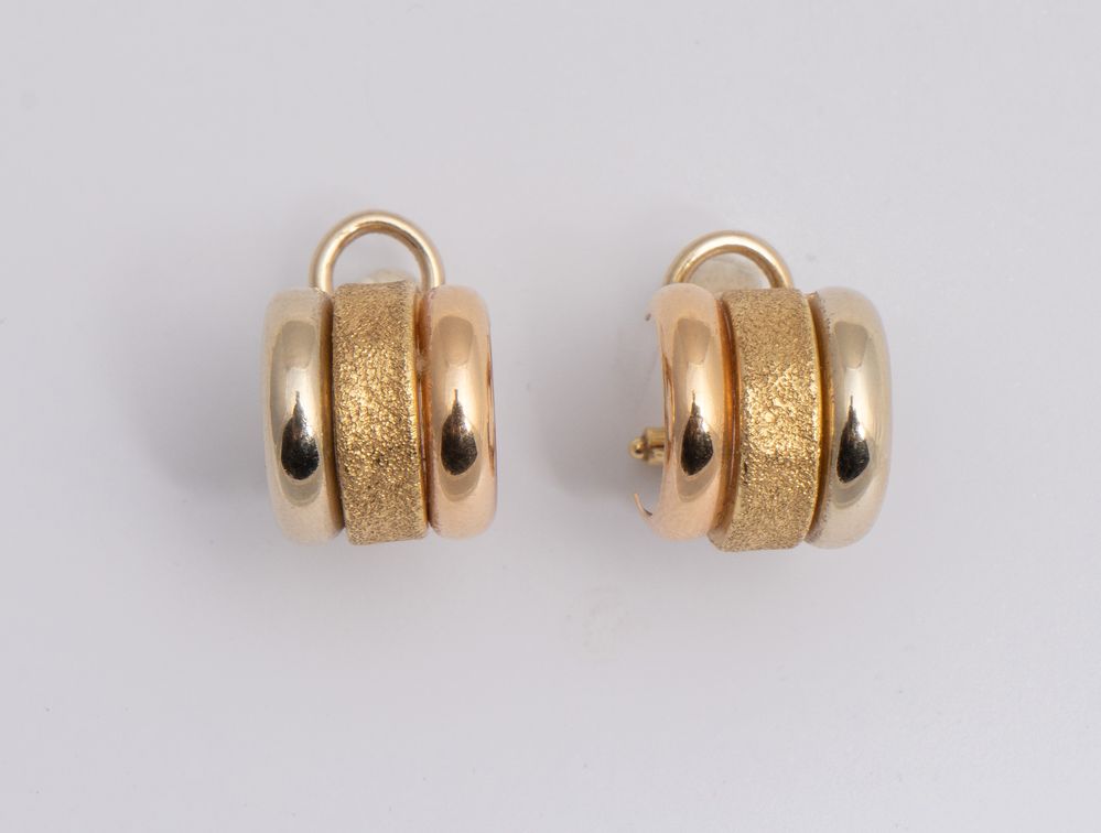 Nei tre colori dell’oro, ciascuno sagomato come una boccola a tre scanalature alternativamente lucide e satinate con chiusura a clip.
