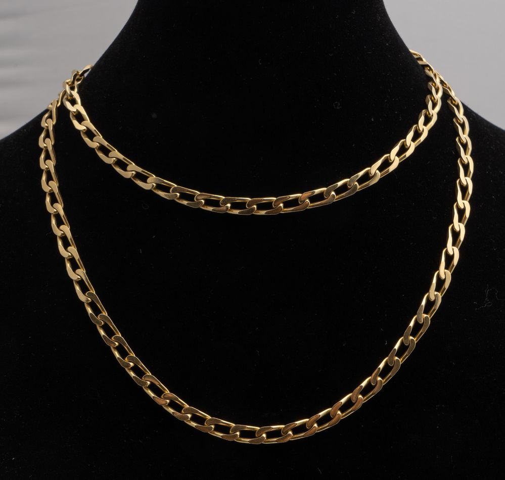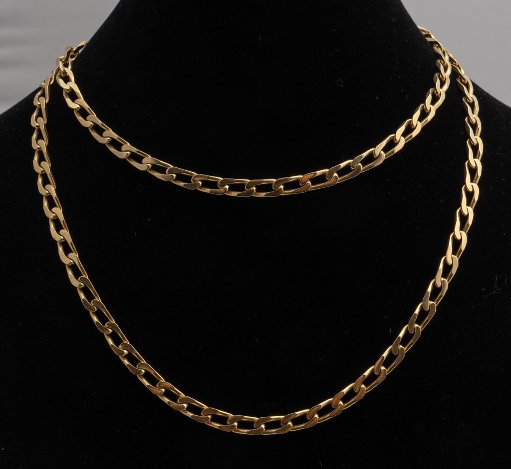 In oro giallo, realizzata ad una fila di maglie groumet, lunghezza totale 85 cm.