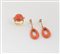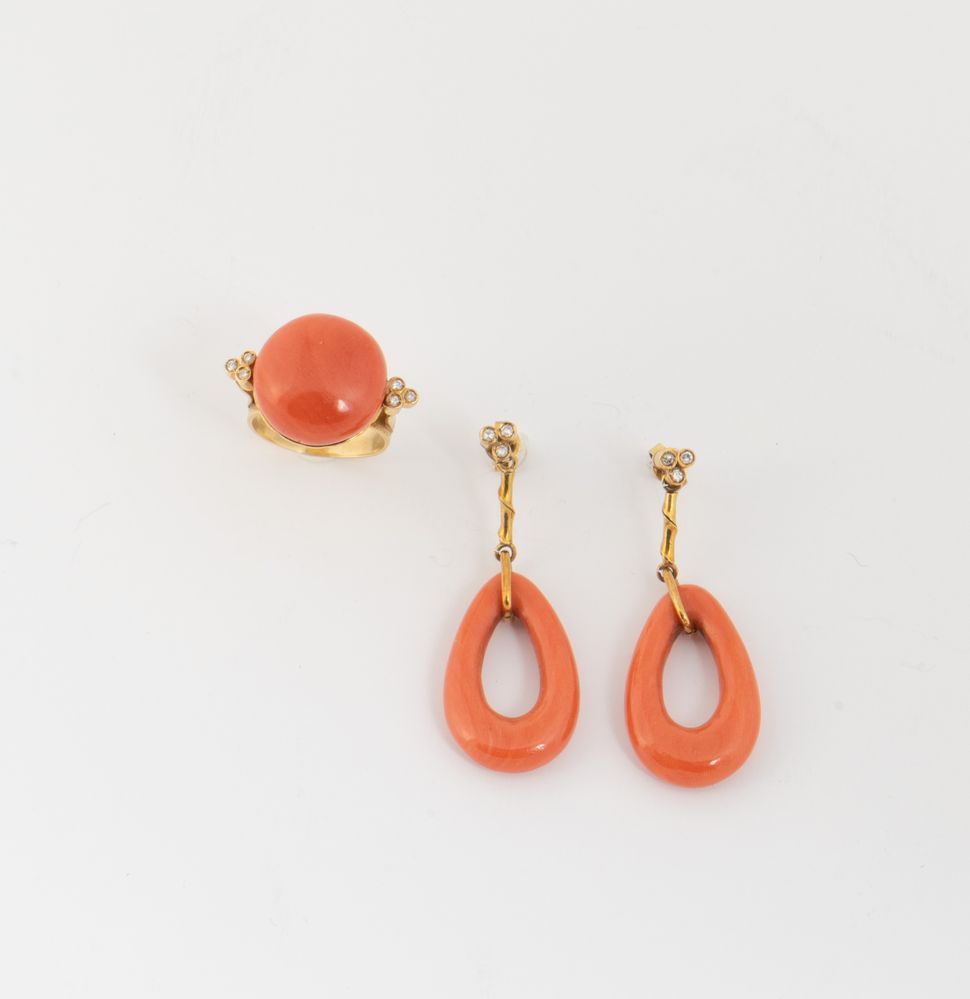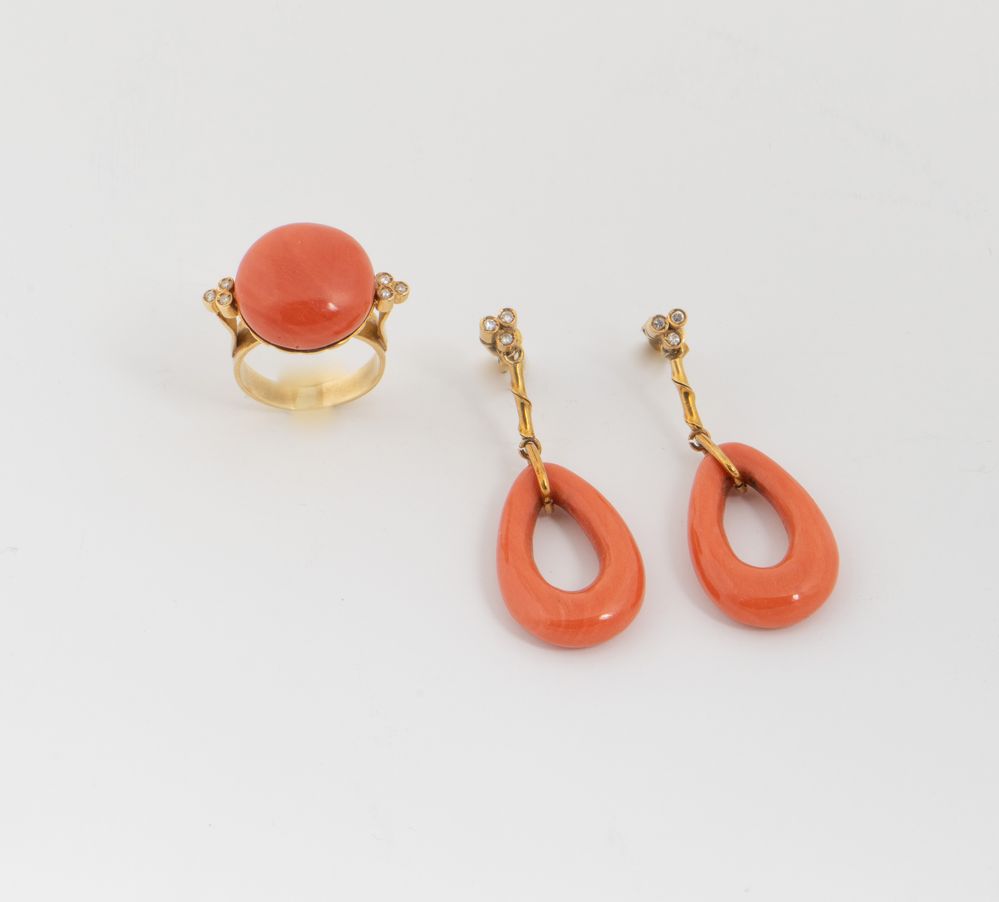 DEMIPARURE IN ORO, DIAMANTI E CORALLO Costituita da orecchini e anello in oro...