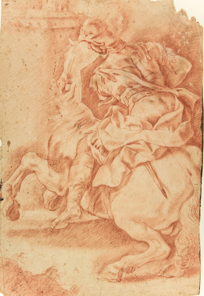 Anonimo piemontese-lombardo degli inizi del XVI secolo. Cavaliere a cavallo (recto). Studi di figure (verso). Matita rossa, penna e inchiostro (recto). Matita nera (verso), su carta bianca vergellata pesante. Foglio: mm 380x255. Disegno molto "vissuto", e rimasto chiaramente per lungo tempo in bottega. È probabile opera di un artista della cerchia di Tanzio da Varallo o di un suo modesto imitatore. Gli schizzi sul verso appartengono a mano diversa, risalente al secolo XVIII. Il foglio presenta una vistosa macchia oleosa in alto a destra e alcune mancanze derivanti dall'essere stato appeso. La carta è antica e di fattura grossolana.