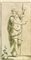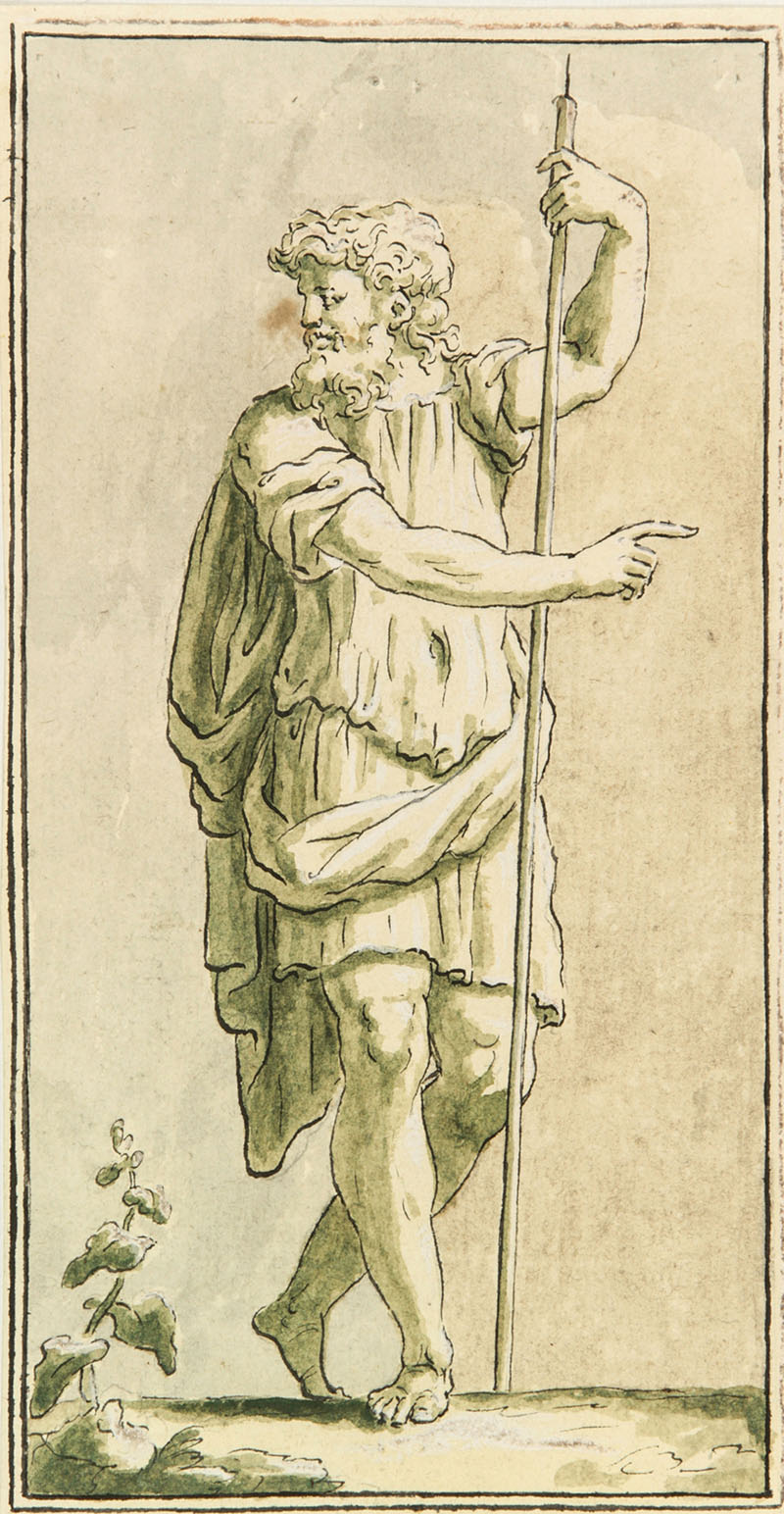 Anonimo romano della fine del XVIII secolo. Figura maschile con bastone. Matita di grafite, penna e inchiostro, acquerello verde, grigio e marrone; tocchi di biacca; carta bianca vergellata. Foglio: mm 220x115. Il disegno rappresenta uno studio isolato di bottega, contornato da due linee di cornice a penna, forse interpretabile come soggetto repertoriale proveniente da un taccuino di schizzi. Al punto di cucitura di questorebbero, infatti, pensare i due piccoli fori, visibili sulla parte centrale del foglio in alto, risparmiati dall'acquerellatura. Sia il disegno, che il foglio, sono in ottime condizioni di conservazione: in basso, ai piedi della figura, una piccola macchia e una leggera ossidazione della biacca.