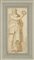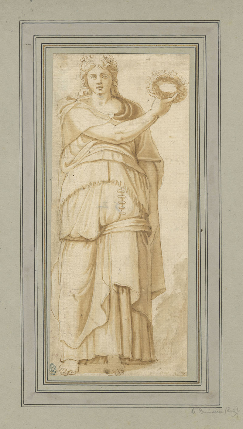 Alessandro Allori (1535-1607). Allegoria della Poesia. 1566-67. Penna e inchiostro acquerellato; carta bianca a vergelle, lievemente preparata. Foglio: mm 271x115. L'opera è un raro studio inedito, appartenente al già conosciuto gruppo dei disegni eseguiti da Alessandro Allori in preparazione ai costumi per la Mascherata con la Genealogia degli Dei, allestita nelle strade di Firenze nel 1566 in occasione dei festeggiamenti per le nozze del principe Francesco de' Medici con Giovanna d'Austria. Il foglio si ricollega ai più vasti gruppi degli Uffizi e della Biblioteca Nazionale Centrale di Firenze (cfr. anche per la bibliografia precedente, Baroni, 2012) e proviene dalla raccolta di Giuseppe Vallardi, alla quale si riferisce il timbro in basso a sinistra (LUGT 1223). Il foglio originale è controfondato, ossia interamente incollato a una carta a vergelle pesante. Lievi danni diffusi (qualche piccolo foro), ma nel complesso in ottimo stato di conservazione.