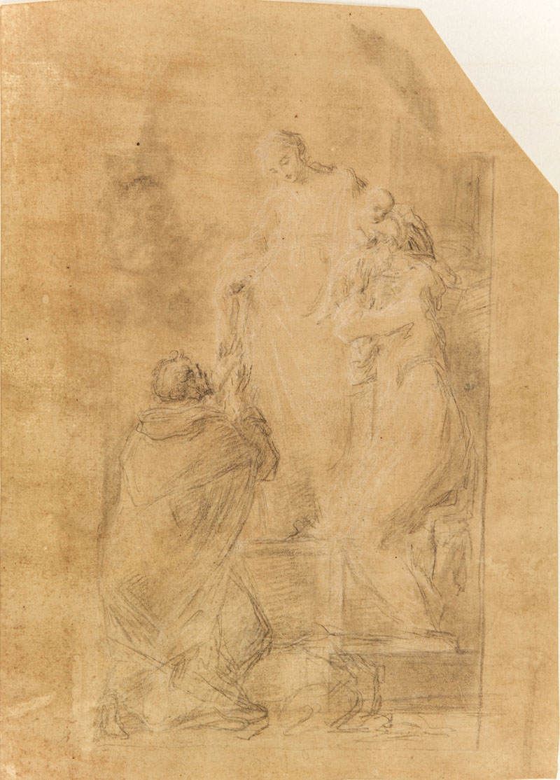 Giuseppe Bazzani (1690-1769). La Madonna consegna lo scapolare a S. Simone Stock e a S. Teresa d’Avila. Prima metà del XVIII secolo. Matita nera e gesso su carta lievemente preparata e tinteggiata, inchiostro marrone; carta bianca a vergelle. Foglio: mm 240x170. Sul verso, in basso, manoscritta a penna e inchiostro un'annotazione antica: "Per 1 Banchiere". Il disegno è tagliato all'angolo in alto a destra. Dal verso, presenta una striscia di carta a rinforzo del bordo destro ed è attaccato al cartoncino dorato e sagomato che funge da cornice (secolo XX, fine) al centro in alto e a sinistra in basso.