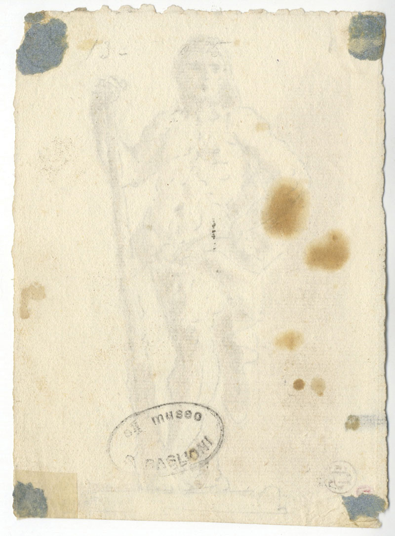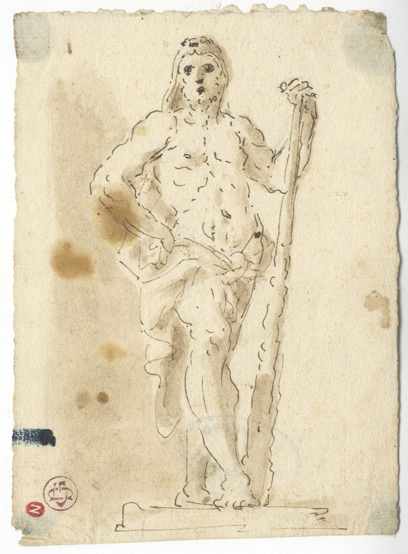 Vittorio Maria Bigari (1692-1776). Studio per una statua di Ercole. Prima metà del XVIII secolo. Penna e inchiostro acquerellato su carta bianca a vergelle, filigranata. Foglio: mm 143x103. Il disegno reca i timbri della collezione del fiorentino Nicola de Giacomo (Lugt 1953a) e di una raccolta non identificata (a cui Lugt ricollega alcune opere derivate da quella De Giacomo, cfr. Lugt 3177). Sul verso il timbro ovale del "Museo S. Baglioni". Il foglio è in buone condizioni di conservazione, nonostante alcune macchie oleose. Sul verso, solo agli angoli, tracce di un precedente incollaggio a un cartoncino azzurro.