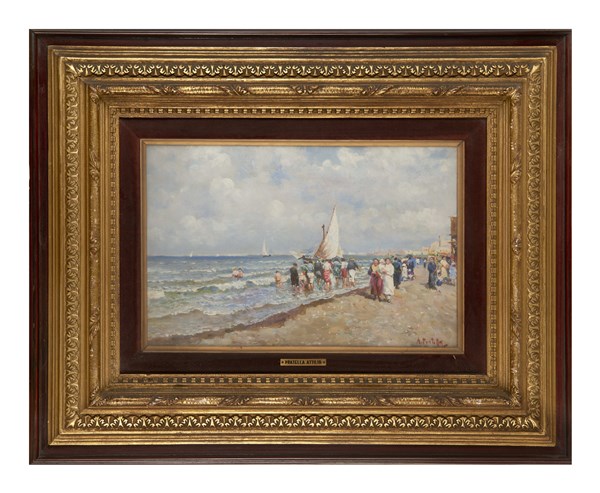 Attilio Pratella "Spiaggia a Portici" olio su compensato (cm 23x34,5) Firmato i