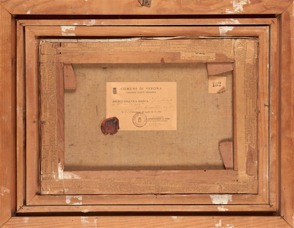 Al retro: cartiglio e timbro a ceralacca della Galleria d'Arte Moderna di Verona firmato dal prof. Antonio Avena; Sul telaio: cartiglio dell'Esposizione Biennale di Venezia, 1912