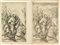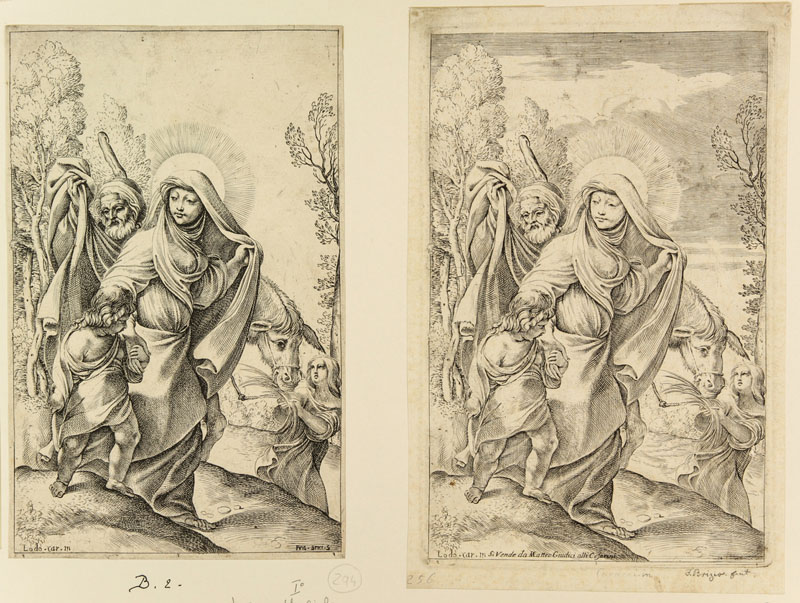 Francesco Brizio (1574 ca.-1623). La Sacra Famiglia ritorna dall'Egitto. Post 1610. (1) Bulino. Foglio: mm 218x138; (2) Bulino. Matrice: mm 219x141. Foglio: mm 240x153. Bartsch, II, n. 204; Nagler, I, p. 141. Birke (TIB), 40 (Comm.), n. 4003.034. Il lotto è composto da due esemplari, rispettivamente in I (1) e in IV (2) stato di 4, della rara stampa citata anche da Bartsch e poi da Kaspar Georg Nagler, del bolognese Franz Brizio (detto anche Briccio), allievo bolognese di Ludovico Carracci, eseguita in stretta collaborazione con il suo maestro che ne fornì il disegno, (si veda l'iscrizione in basso entro i margini a sinistra "Lodo. Car.in" e a destra "Fra.Brici.s"), i due esemplari mantengono la presentazione voluta dall'ultimo collezionista e si trovano montati sullo stesso supporto. Il secondo esemplare oltre all'aggiunta dell'iscrizione in basso, entro i margini "Si vende da Matteo Giudici alli Cesarini" e la cancellazione della firma dell'incisore sulla destra, è caratterizzato dalla presenza delle linee del cielo, totalmente assenti nel primo stato. La (1) è in ottime condizioni di conservazione, seppur rifilata ai margini; l'inchiostratura è fresca e ben definita; il foglio originale, su carta vergellata bianca, rimane attaccato al supporto cartonato sottostante (sec. XX) esclusivamente da due strisce incollate dal verso che tuttavia permettono la piena godibilità dell'esemplare. La (2) presenta un montaggio simile alla (1): si tratta però di un esemplare più stanco e meno definito in quanto a inchiostratura. Presenta inoltre un piccolo foro, ma ha buoni margini e nel complesso è in buono stato.