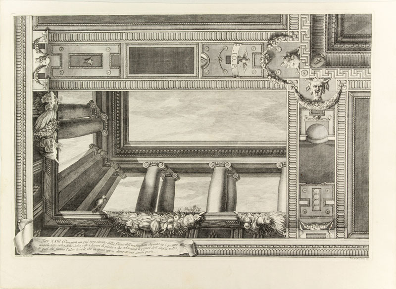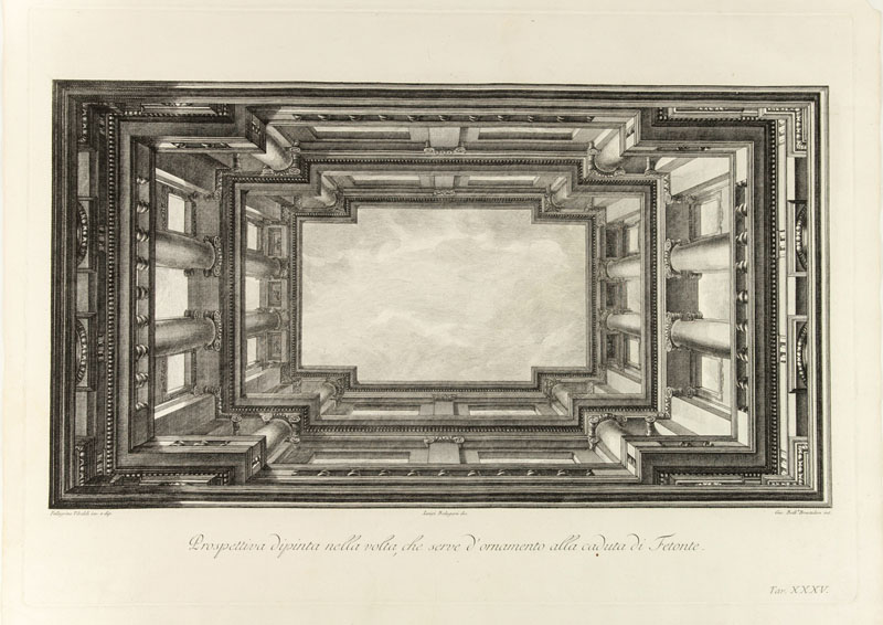 Giovan Battista Brustolon (1712-1796). 1) Architectura picta. 2) Prospettiva dipinta della volta. 1756. (1) Bulino e acquaforte. Matrice: mm 340x494. Foglio: mm 400x550. (2) Bulino e acquaforte. Matrice: mm 370x520. Foglio: mm 400x550. Thieme-Becker, V, p. 151; Zani, 1820, I, 5, Parma 1820, p. 68; Cicogna, 1847, p. 614; Alpago Novello, 1939-40, pp. 557-73. Nella prima è l'iscrizione: "Dimostra un più vero ritratto della forma dell'architettura dipinta ne i quattro angoli della volta della sala e de i lavori di plastica che adornano le pitture dell'istessa volta, di quelle che fanno l'altre tavole, che in quest'opera dimostrano simili parti / Angiolo Carboni dis. ; Gio B.a Brustolon int." In basso a destra, inciso: "Tav. XXIII".- Nella seconda, nel margine: "Prospettiva dipinta nelle volte, che serve d'ornamento alla Caduta di Fetonte da Pellegrino Tibaldi/ Tav. XXV". Le due stampe fanno parte del volume Pitture di Pellegrino Tibaldi e di Niccolo Abbati esistenti nell'Instituto di Bologna descritte ed illustrate da Giampietro Zanotti segretario dell'Accademia Clementina, In Venezia, 1756 [In Venezia : Presso Gianbatista Pasquali stampatore e libraio all'Insegna della Felicità delle Lettere con licenza de' Superiori, 1756]. Le incisioni del volume sono eseguite da Bartolomeo Crivellari e Joseph Wagner, oltre che da Brustolon, da invenzioni di Tibaldi e Ludovico Carracci; i disegni per le incisioni sono di Giovan Battista Moretti, Antonio Maria Zanetti, Gaetano Gandolfi e Giovanni Domenico Ferretti.  Le due stampe sono su carta bianca compatta con filoni. Ampi margini. Ottima conservazione.