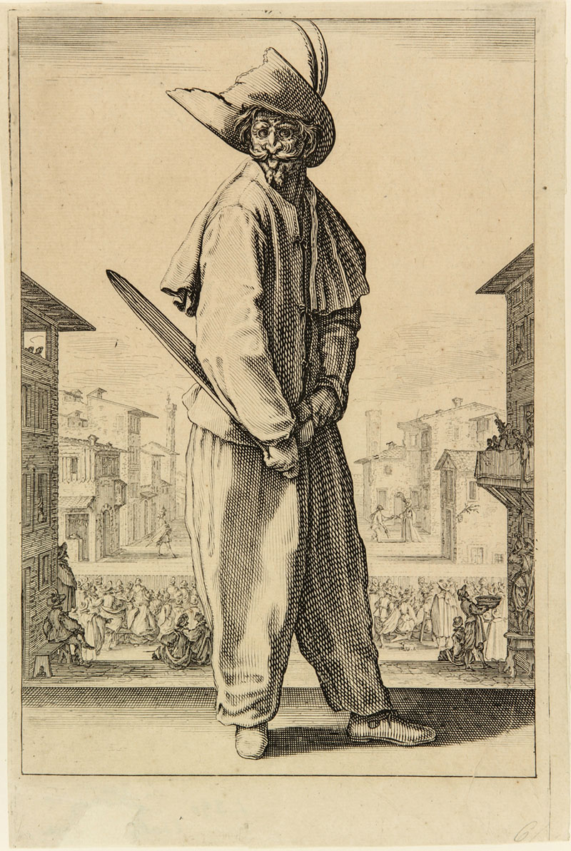 Jacques Callot (1592-1635). Scapino. 1618-1620. Acquaforte. Foglio: mm 238x152. Lieure, n. 290; Meaume, n. 629. Stampa conosciuta in unico stato, appartenente alle serie progettate in Italia ma pubblicate al rientro in Francia dell'autore. Esemplare rifilato in basso e lungo il bordo sinistro (da metà). Stampa ben definita e fresca, su carta bianca sottile a vergelle. Il foglio è incollato sul verso, lungo il bordo superiore, al supporto di cartone sottostante soltanto per due punti (strisce di carta incollata, XX secolo). Sul verso del foglio, lungo il lato destro sono visibili due rinforzi cartacei. Nel complesso il foglio è in buone condizioni di conservazione.