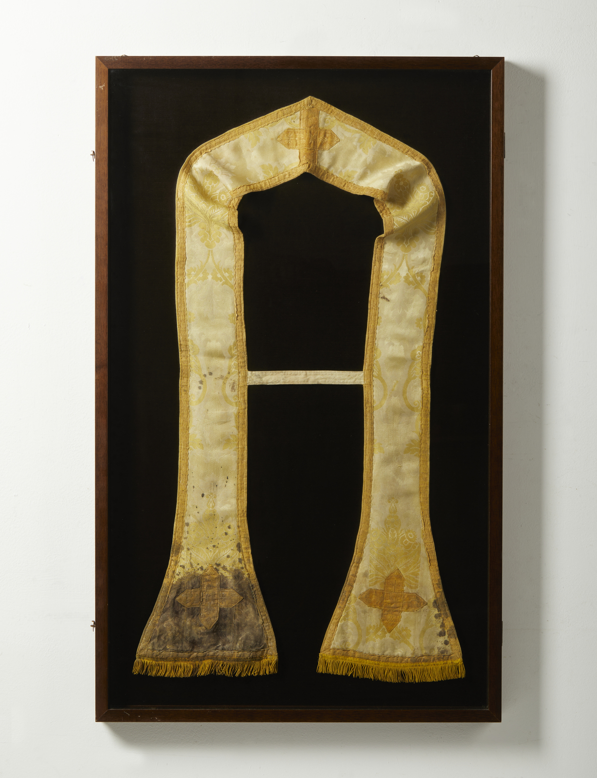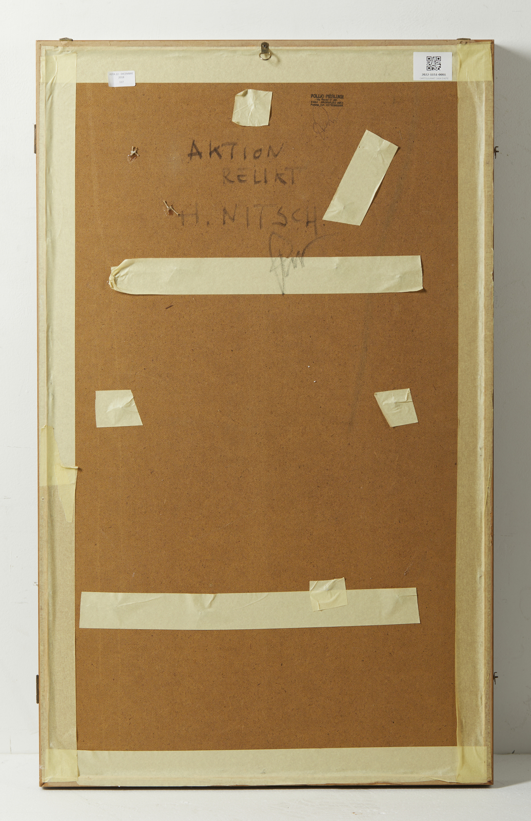 NITSCH HERMANN (1938 - 2022) Stola. Aktion Relikt. Tecnica mista . Cm 58,50 x 98,00. Firma al retro. Autentica dell'artista su fotografia. Opera archiviata presso l' Atelier Hermann Nitsch, Prizendorf, come da documentazione allegata all'opera riportante il timbro O.M.Theater e il relastivo numero d'inventario. Cornice presente