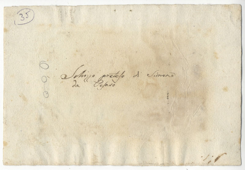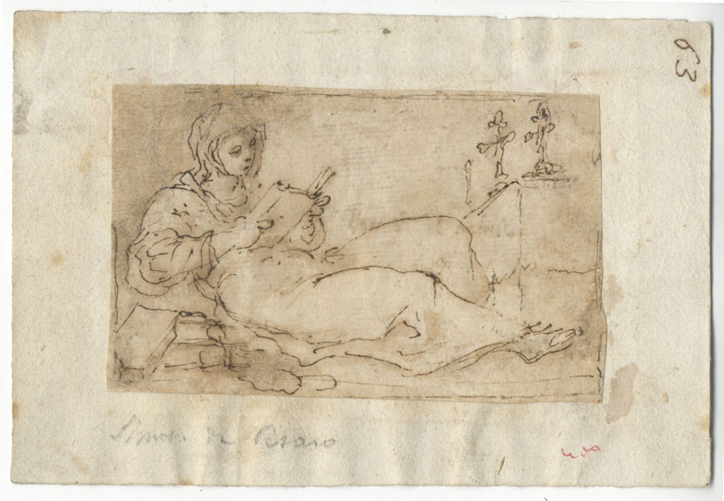 Simone Cantarini (1612-1648). Santa che legge. Prima metà del XVII secolo. Penna e inchiostro, su carta bianca a vergelle, preparata e lievemente tinteggiata. Foglio: mm 71x113. Sul verso, manoscritta a penna e inchiostro, l'annotazione antica "Simon da Pesaro". Sul supporto in alto a destra la cifra "63". Lo schizzo e il suo supporto sono stati evidentemente ritagliati da un album. Anche su questo è un'iscrizione più recente a matita nera "Simon da Pesaro" e, sul verso, un'annotazione più antica, a penna e inchiostro: "Schizzo preteso di Simone/da Pesaro". Il foglio è stato oggetto di un intervento di restauro che l'ha interamente staccato dal supporto cartaceo sottostante (secolo XVIII), al quale rimane tuttavia ancora collegato da due piccole strisce di carta giapponese lungo il bordo superiore del verso.