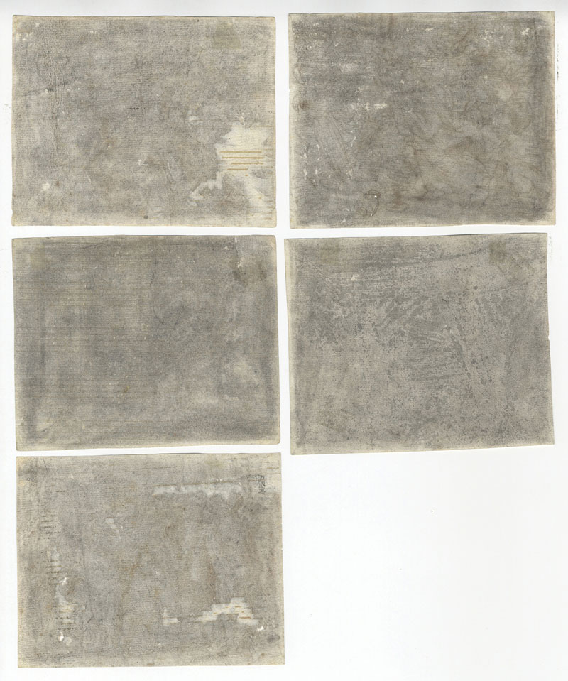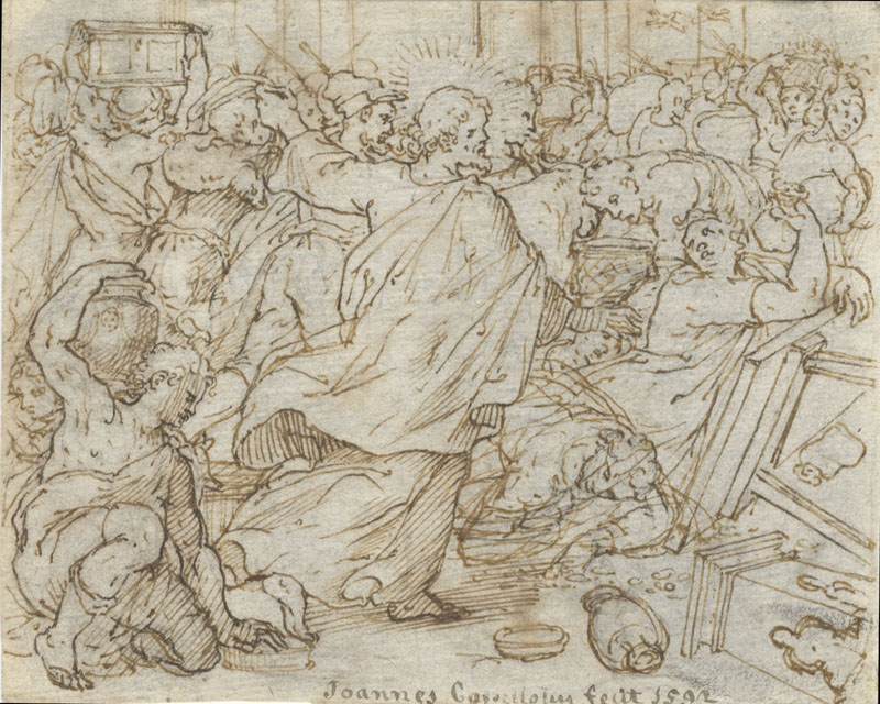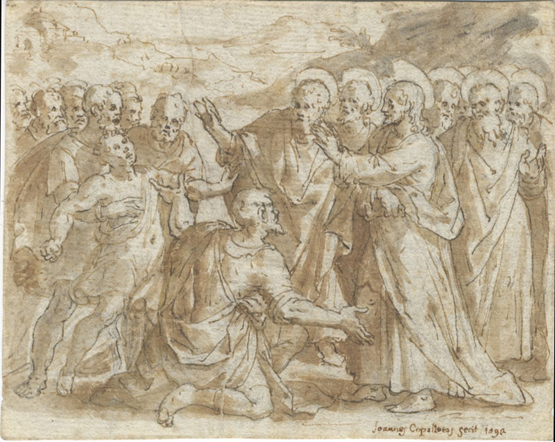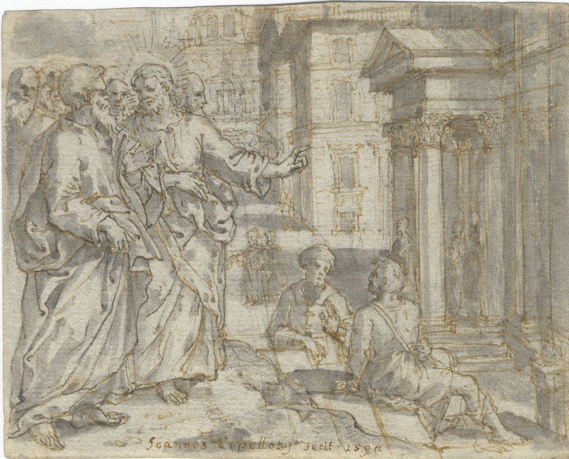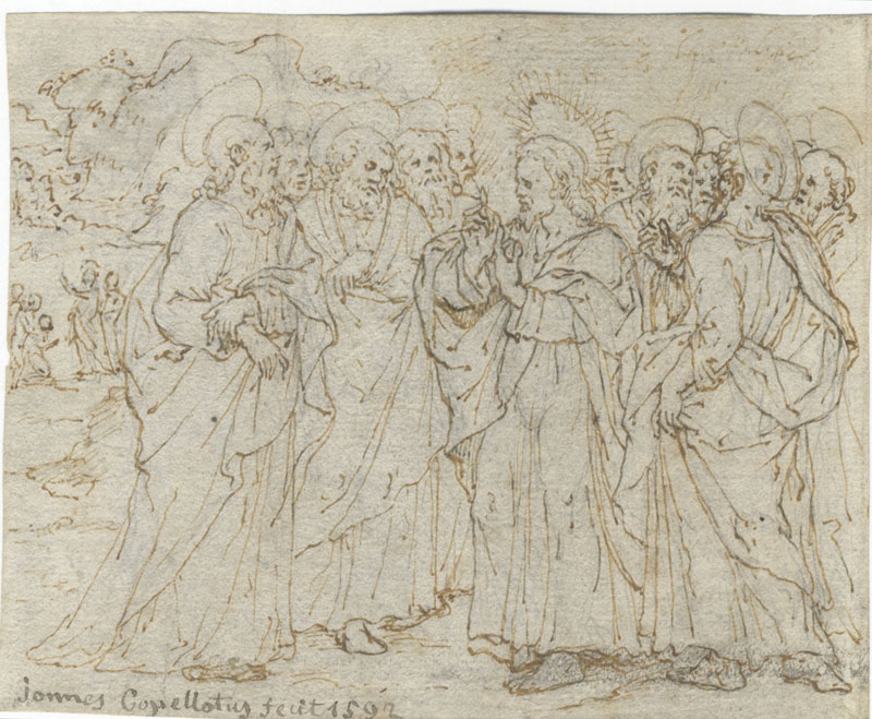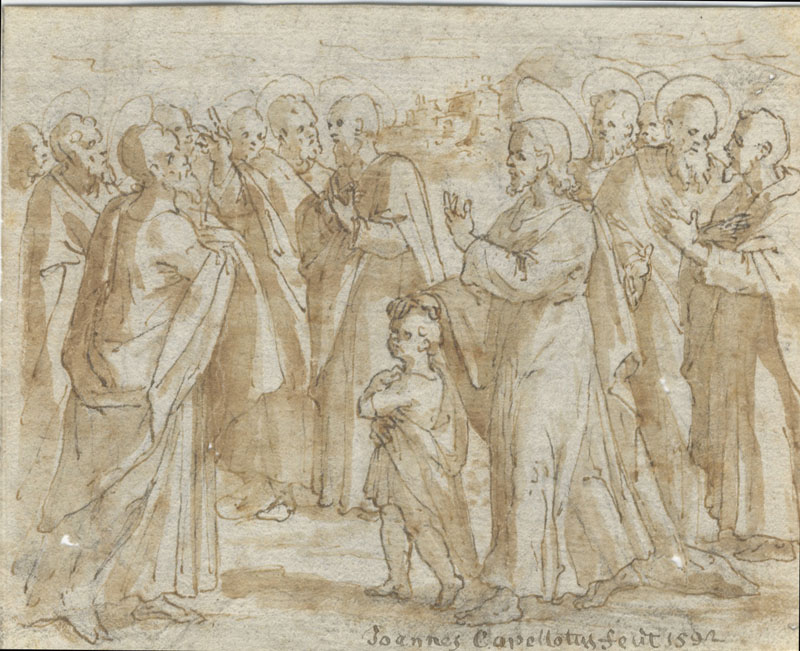 Giovanni Capellotti (? -? ). Cinque disegni con Storie della vita di Cristo. 1592. Matita nera, penna e inchiostro; carta bianca fine a vergelle filigranata (solo il 3); il verso è annerito da polvere di matita nera. I contorni delle figure sono ripassati con uno stilo. Foglio 1 (Cacciata dei Mercanti dal Tempio): mm 103x128. Foglio 2 (Lasciate che i bimbi vengano a me): mm 102x127. Foglio 3 (Predicazione alle genti): mm 103x126. Foglio 4 (Cristo risana lo storpio): mm 100x126. Foglio 5 (Cristo libera l'indemoniato): mm 100x127. Eseguiti forse in preparazione di un'incisione su lastra di metallo, i disegni sono tutti firmati e datati. A parte lievi danni e piccoli fori nel 3, i disegni sono in ottime condizioni di conservazione.