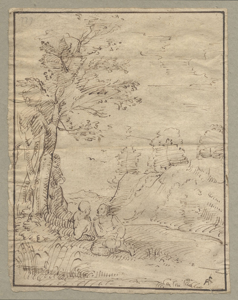 Annibale Carracci (1560-1609). Tre figure in un paesaggio. 1590 ca. Penna e inchiostro; carta bianca a vergelle. Foglio: mm 195x155. Il disegno è inquadrato da una linea di cornice a penna e inchiostro. In basso a destra, manoscritta, la sigla "AC". Il disegno è tracciato con straordinaria sicurezza, senza pentimenti ed è riconducibile alle prime prove grafiche di Annibale nell'ambito della pittura di paesaggio. Il foglio è parzialmente incollato al cartone sottostante (sec. XX). A parte un lieve ingiallimento della carta e le tracce di piegature, è in buone condizioni di conservazione.