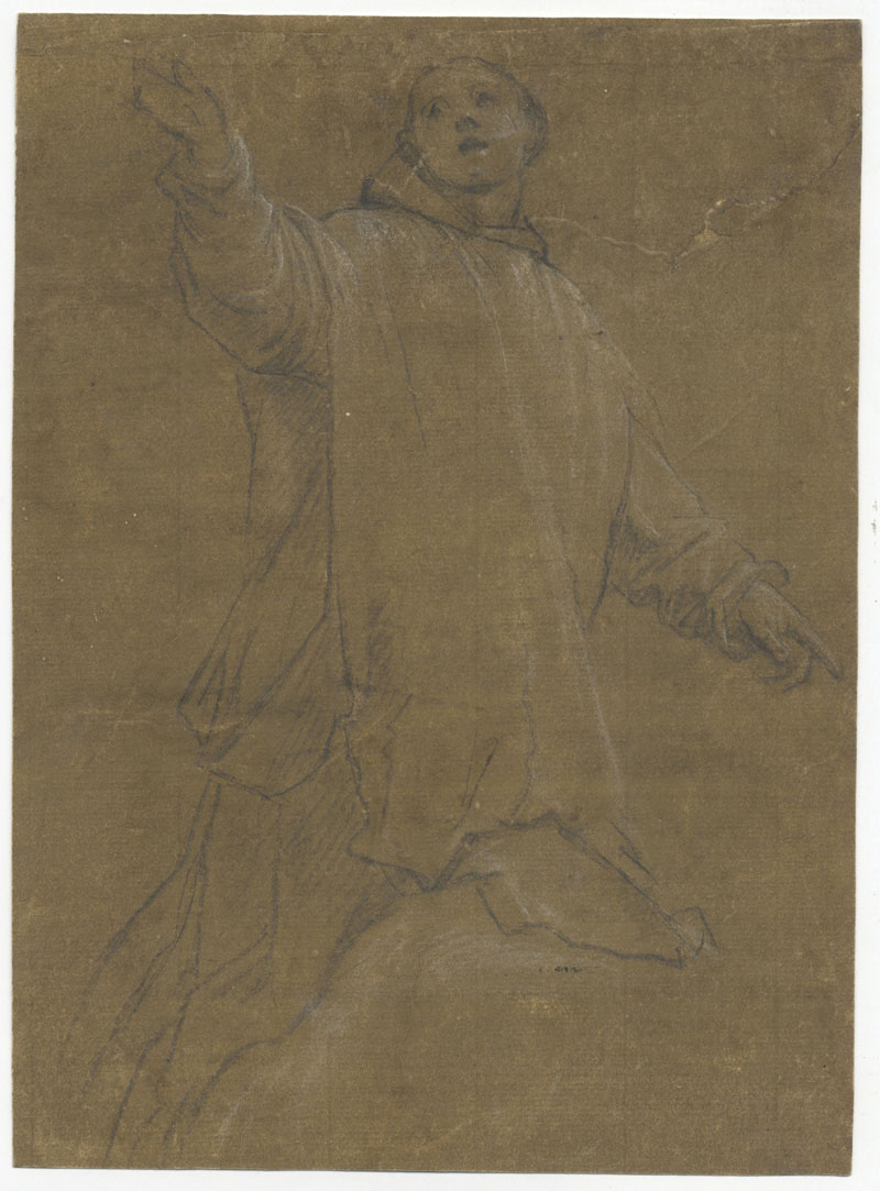 Giovan Battista Crespi (detto il Cerano) (1573-1632). Santo orante a braccia aperte. Prima decade del XVII secolo. Matita nera e gesso; carta preparata e tinta. Foglio: mm 212x155. Il disegno mantiene intatte le caratteristiche qualitative della mano del Cerano, nonostante la leggera ossidazione della preparazione abbia provocato un oscuramento della superficie. Il disegno è interamente incollato a una carta bianca -forse settecentesca- pesante a vergelle, su cui s'intravedono, dal verso, i segni agli angoli di un precedente incollaggio. Il foglio originale non è in perfette condizioni e mostra alcune mancanze nella parte centrale.