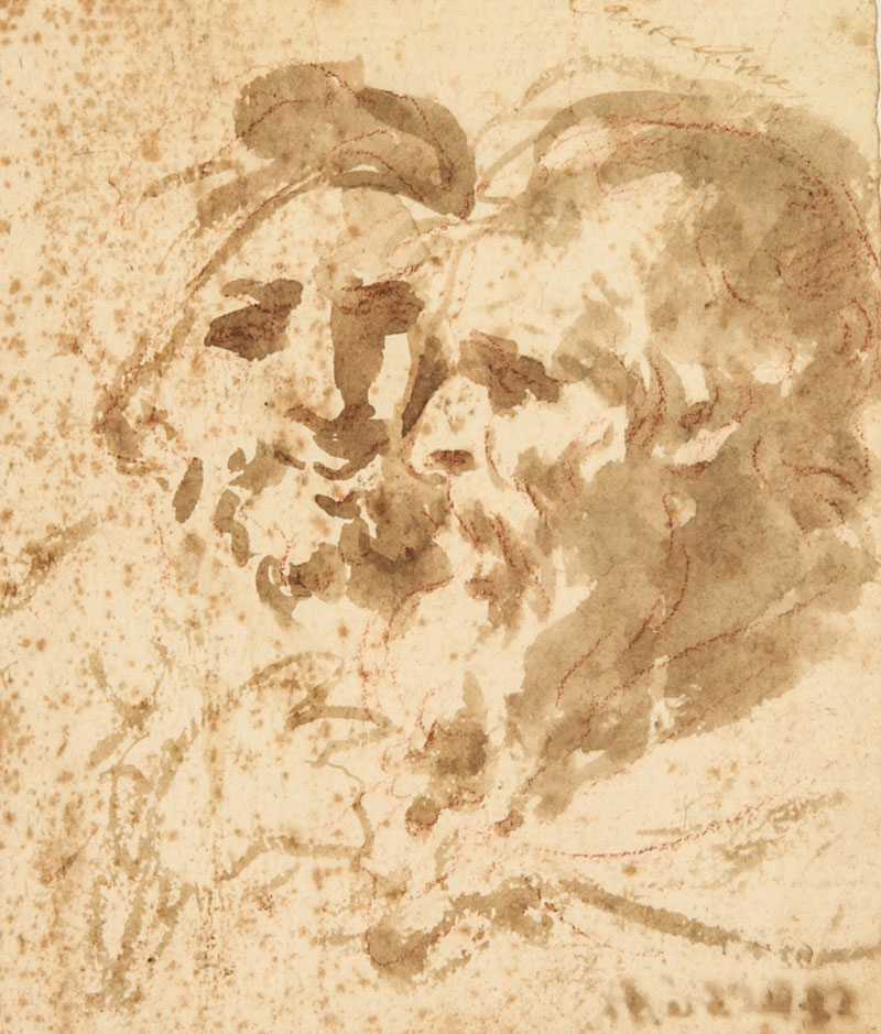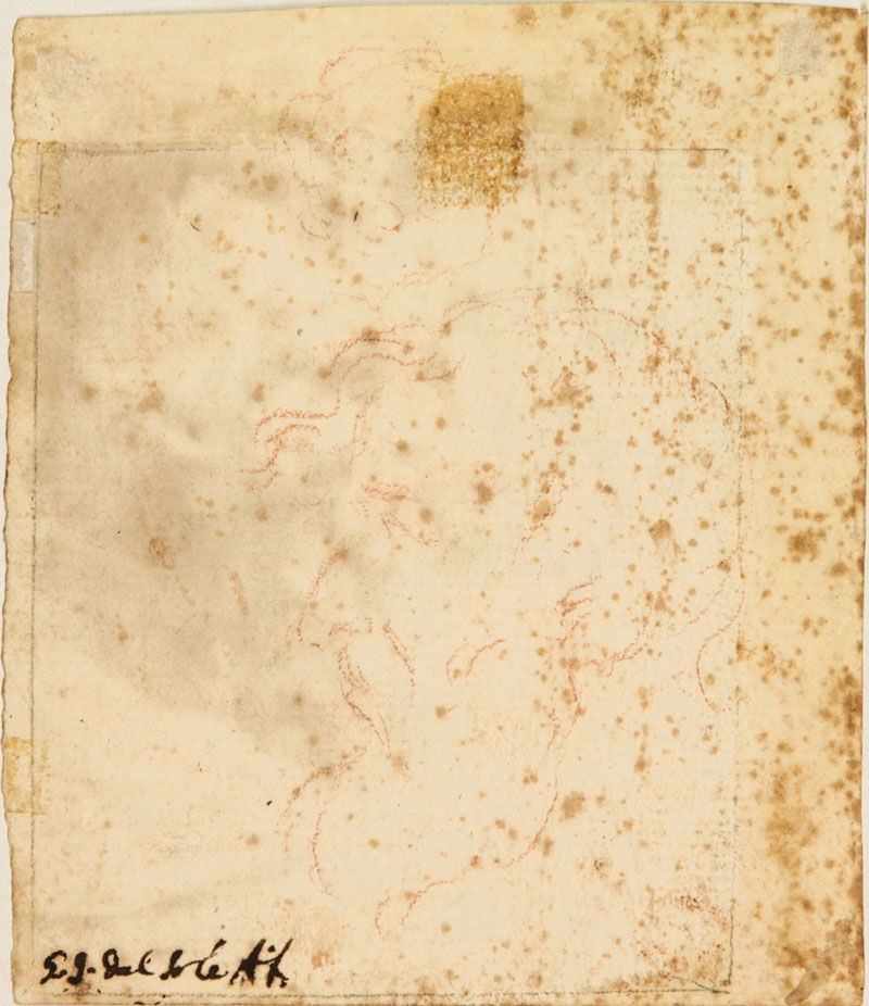 Giovan Gioseffo Dal Sole (1654-1719). Studi di due teste. Secolo XVII. Matita rossa e inchiostro acquerellato marrone; carta bianca a vergelle. Foglio: mm 120x103. Sul verso alcuni schizzi a matita rossa e, all'angolo sinistro, manoscritta a penna e inchiostro l'iscrizione "G. g. Dal Sole dis.". Nonostante le condizioni non ottime del foglio, la qualità grafica del disegno, caratterizzato da un fluido tratto a matita rossa rinforzato dall'acquerellatura, è intatta. Il foglio presenta numerose macchie e foxing diffuso.