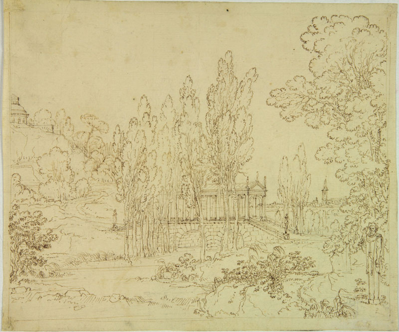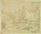 Rodolfo Fantuzzi (1781-1832). Paesaggio fluviale con ponte in forma di tempio ed erma. 1815 ca. Penna e inchiostro su tracce lievissime di matita nera; carta bianca a vergelle, tardo-settecentesca, filigranata. Foglio: mm 191x228. Lo schizzo, realizzato con mano sicura e senza ripensamenti, è chiaramente uno studio preparatorio per una composizione compiuta, racchiusa in quattro linee di cornice a penna eseguita con la medesima tecnica. Il foglio richiama le invenzioni illusionistiche della decorazione interna delle sale di Palazzo Hercolani a Bologna (ca. 1815-16, cfr. Roli, 1977, ad Indicem; L'arte del Settecento, 1979, p. 341). Il foglio è in ottime condizioni di conservazione: leggere spellature della carta lungo i bordi e tracce di due precedenti incollaggi agli angoli superiori in alto.