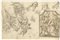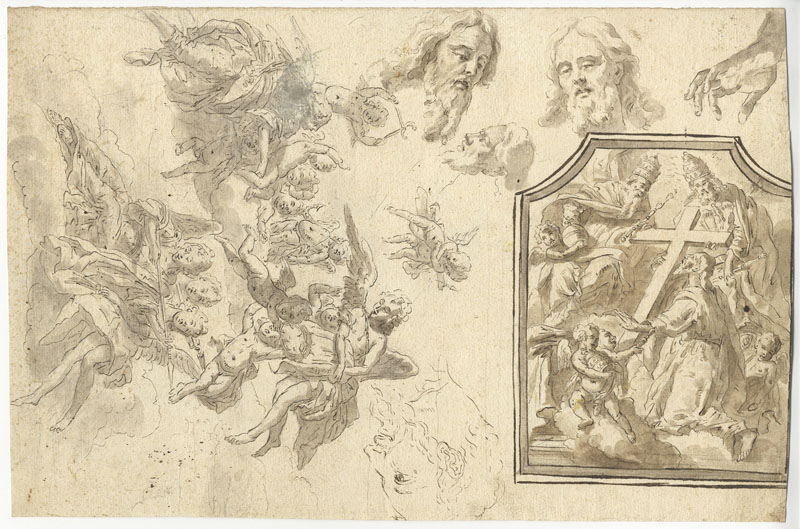 Giovan Battista Gaulli (detto il Baciccio) (1639-1709). Angeli Musicati e Visione di Santo (recto). Studi di decorazioni (verso). Seconda metà del XVII secolo. Recto: penna e inchiostro acquerellato, matita nera. Verso: matita nera, penna e inchiostro; carta bianca a vergelle, filigranata. Foglio: mm 380x251. Il foglio è stato utilizzato come strumento di studio nella preparazione forse di più opere. Macchie diffuse ma nel complesso è in ottimo stato di conservazione.