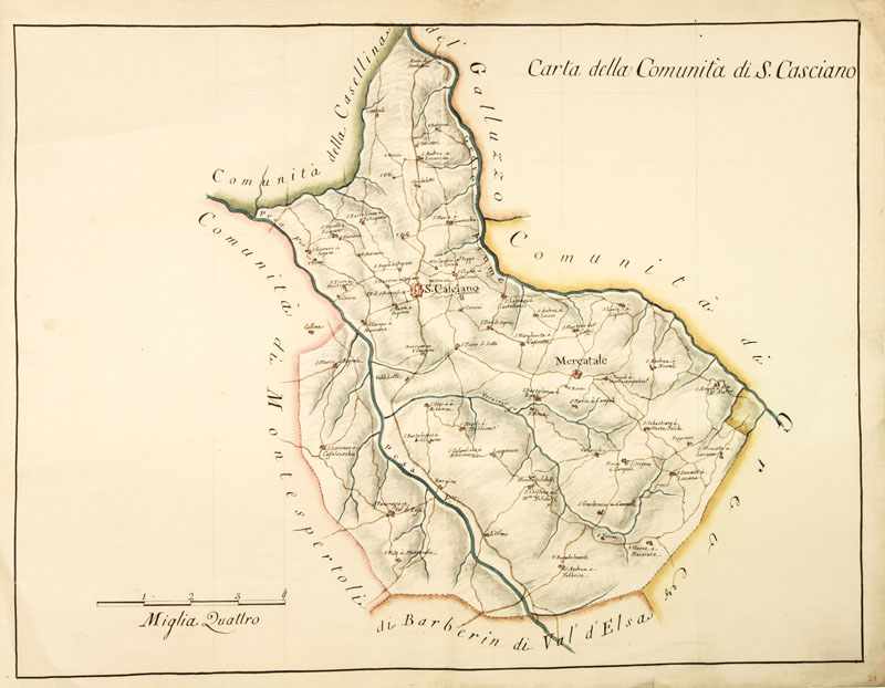 Luigi Giachi (XVIII secolo) e altri. Carta geografica manoscritta della Comunità di S. Casciano, scala Miglia Quattro. XVIII secolo. Matita nera, penna e inchiostro, acquerello grigio, azzurro, giallo, rosso-marrone; carta pesante. Foglio: mm 555x430. La scala della carta è espressa in miglia toscane. Nella carta il territorio è delimitato a nord dal fiume Greve, che lo separa dalla comunità del Galluzzo e da quella di Greve, e a sud è attraversato dal fiume Pesa, confinante con le comunità di Barberino, Montespertoli e Casellina. A parte rare spellature lungo i bordi, un piccolo strappo nel margine inferiore e un lieve ingiallimento diffuso, il foglio è in ottime condizioni di conservazione.