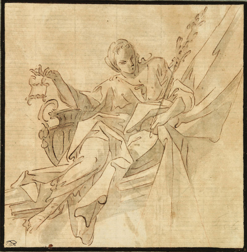 Corrado Giaquinto (1703-1766). Allegoria della Temperanza. 1760 ca. Matita rossa, penna e inchiostro, inchiostro grigio acquerellato su carta bianca a vergelle, filigranata (sole a cinque punte inscritto in cerchio, diam. mm 45) lievemente tinteggiata. Foglio: mm 157 x 155. Il marchio ripetuto sia sul disegno che sul supporto, appartiene alla Collezione di Jean Pierre Cornet (Paris ca. 1970, cfr. Lugt 3570). L'attribuzione a Corrado Giaquinto di questo studio è convincentemente confermata dal confronto con lo stile veloce ed essenziale dei fogli preparatori il Palazzo Reale di Madrid, opera databile tra il 1760 e il 1762, conservati in gran parte nella Certosa di San Martino a Napoli (cfr. Muzii Cavallo, 2005). In particolare, la citazione del cornicione in questo studio potrebbe proprio riferirsi alla preparazione delle finte allegorie in stucco delle Virtù e delle Arti. Il disegno, ottimamente conservato, è interamente incollato su cartoncino azzurro e contornato da una linea di cornice a pennello.