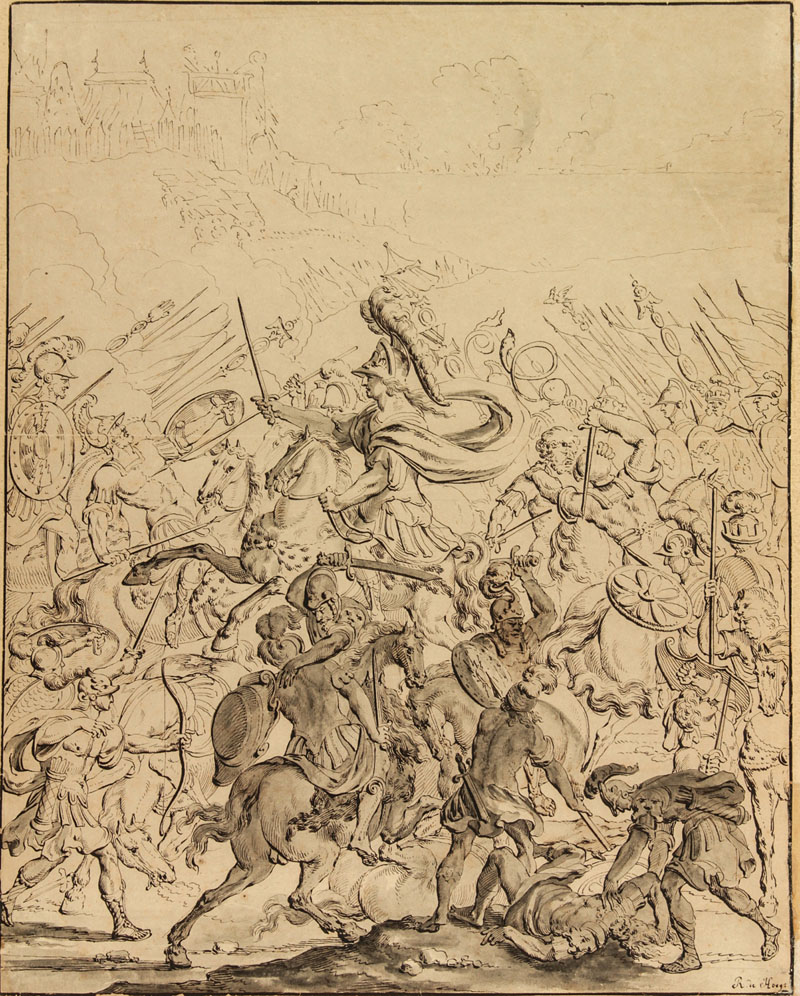 Romeyn Hooghe (de) (1645-1708). Battaglia. Seconda metà XVII secolo. Penna e inchiostro nero e grigio acquerellato; carta bianca a vergelle. Foglio: mm 348x276. Il disegno è firmato in basso a destra a penna "R. de Hooge". La composizione inquadrata da una linea di cornice a penna e inchiostro nero, è chiaramente uno studio preparatorio per una stampa. Il tratto a penna, molto sicuro e pulito, denota la grande qualità del suo autore, uno dei maggiori acquafortisti della seconda metà del XVII secolo (cfr. Dallet–Petukhova, 2009; inoltre anche Landwehr, 1973; Coppens, 1995). Il disegno è in ottime condizioni di conservazione, a parte un lieve ingiallimento. Il foglio si trova in passe-partout (XX secolo): non è controfondato ma incollato per tre angoli (in basso a destra è libero) al supporto sottostante.