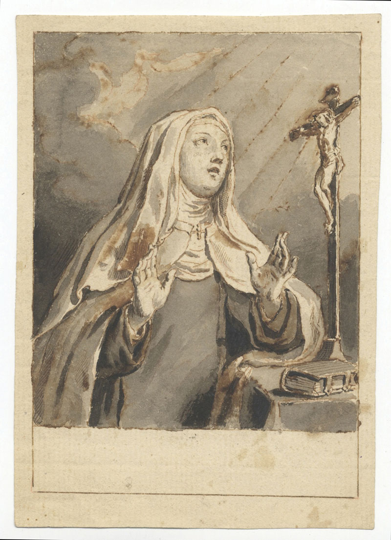 Pietro Antonio Novelli (1729-1804). Santa in adorazione del Crocifisso (Santa Teresa d’Avila?). XVIII secolo. Penna e inchiostro nero e grigio acquerellato; carta bianca a vergelle. Foglio: mm 154x108. A parte lievi macchie di vernice, il disegno è in ottimo stato di conservazione.