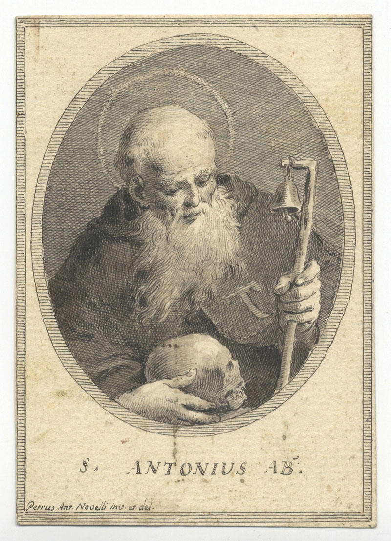 Pietro Antonio Novelli (1729-1804). Sant’Antonio Abate. XVIII secolo. Penna e inchiostro nero e grigio, anche acquerellato; carta bianca a vergelle. Foglio: mm 122x86. Firmato in basso a sinistra, a penna: "Petrus Ant. Novelli inv. et del.". Sotto il medaglione "S.ANTONIUS AB.". Il foglio è interamente incollato al supporto sottostante, una carta vergellata bianca (sec. XIX). A parte piccole macchie d'inchiostro, è in ottimo stato di conservazione.