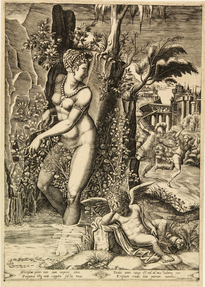 Gaspare Osello (detto Patavinus) (1536-1560/80 ca.). Venere nasce dalle spine. 1564. Bulino. Matrice: mm 298x211. Foglio: mm 305x217. P. Bellini (1998), n. 28. Esemplare (I stato di 3) derivato da Luca Penni, a sua volta da una prima invenzione di Giorgio Ghisi (cfr. Boorsch-Spike (TIB), n. 40-[I] 400) ben conservato sebbene lievemente ingiallito. La stampa è su carta bianca a vergelle e conserva buoni margini. Sul verso, lungo il bordo destro, permangono i segni di un precedente montaggio.