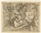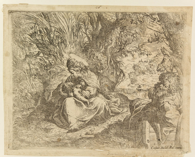Camillo Procaccini (1551-1629). Riposo durante la fuga in Egitto. ante 1587. Acquaforte. Matrice: mm 225x280. Foglio: mm 240x300 ca. Bartsch XVIII, 20.3 Si tratta di un buon esemplare, anche se non freschissimo, della stampa originale (I stato di 2) (Bartsch ne cita uno solo). In alto nel cartiglio: "Camillo Percaci/no Inuent./Incidit"; in basso, all'interno dei margini, a destra: "Caspar. Daloli. Bol: excu.". L'esemplare, su carta bianca a vergelle conserva ancora buoni margini. Vi sono macchie diffuse e un foro nel margine inferiore al centro.