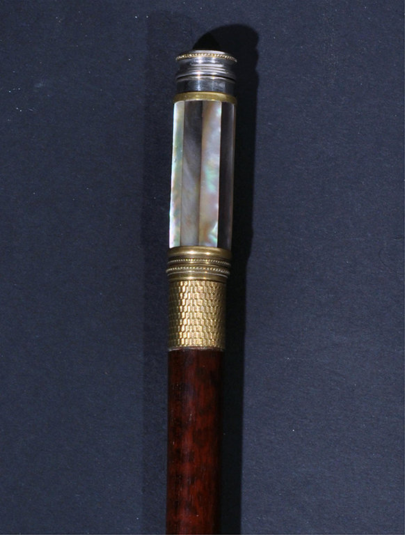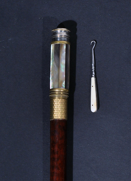 Bastone da donna con manico in madreperla dotato di un vaporizzatore di profumo e, svitandolo, l’accessorio uncinato per tirare le calze