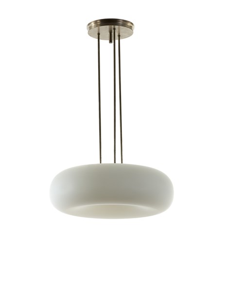 Lampada a sospensione modello "2356". Milano, 1964. Ottone nichelato e vetro bianco satinato. (d cm 50) (lievi difetti)
