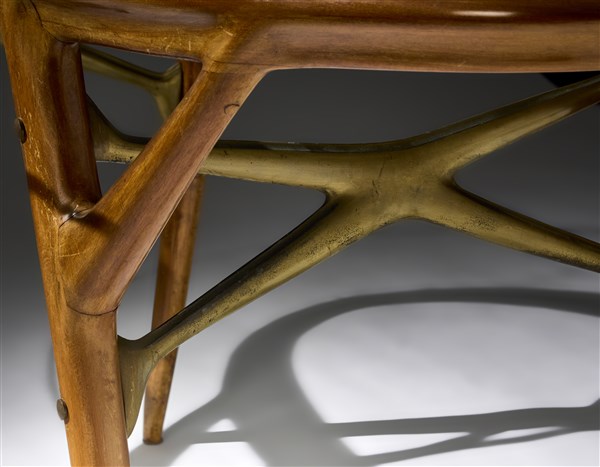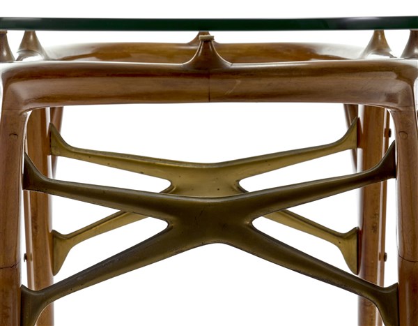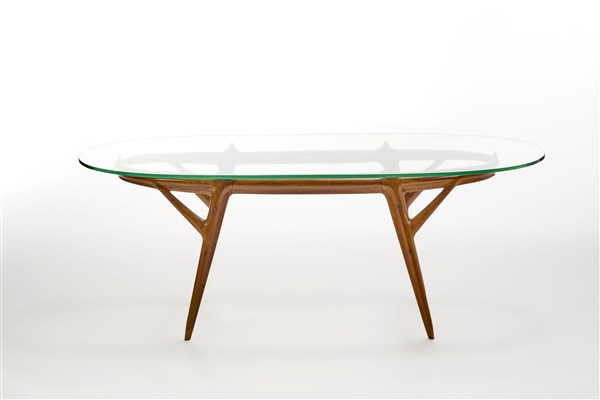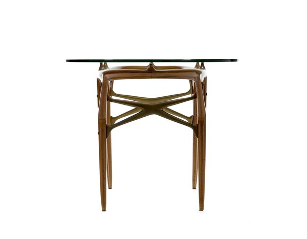 Tavolo. Cantù, anni '50. Gambe in legno massello di mogano sagomate a forcella e puntone collegate da controventi in fusione di ottone, piano ovoidale in cristallo molato di forte spessore. (cm 204,5x78x93) (lievi difetti e piccole mancanze)
