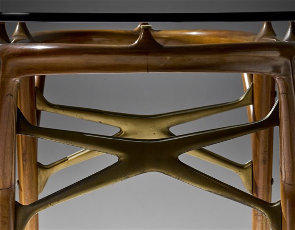 Table. Cantù, 1950s. Solid mahogany wood legs connected by cast brass bracing, ovoid top of thick beveled crystal glass. (204.5x78x93 cm.) (slight defects and small losses)